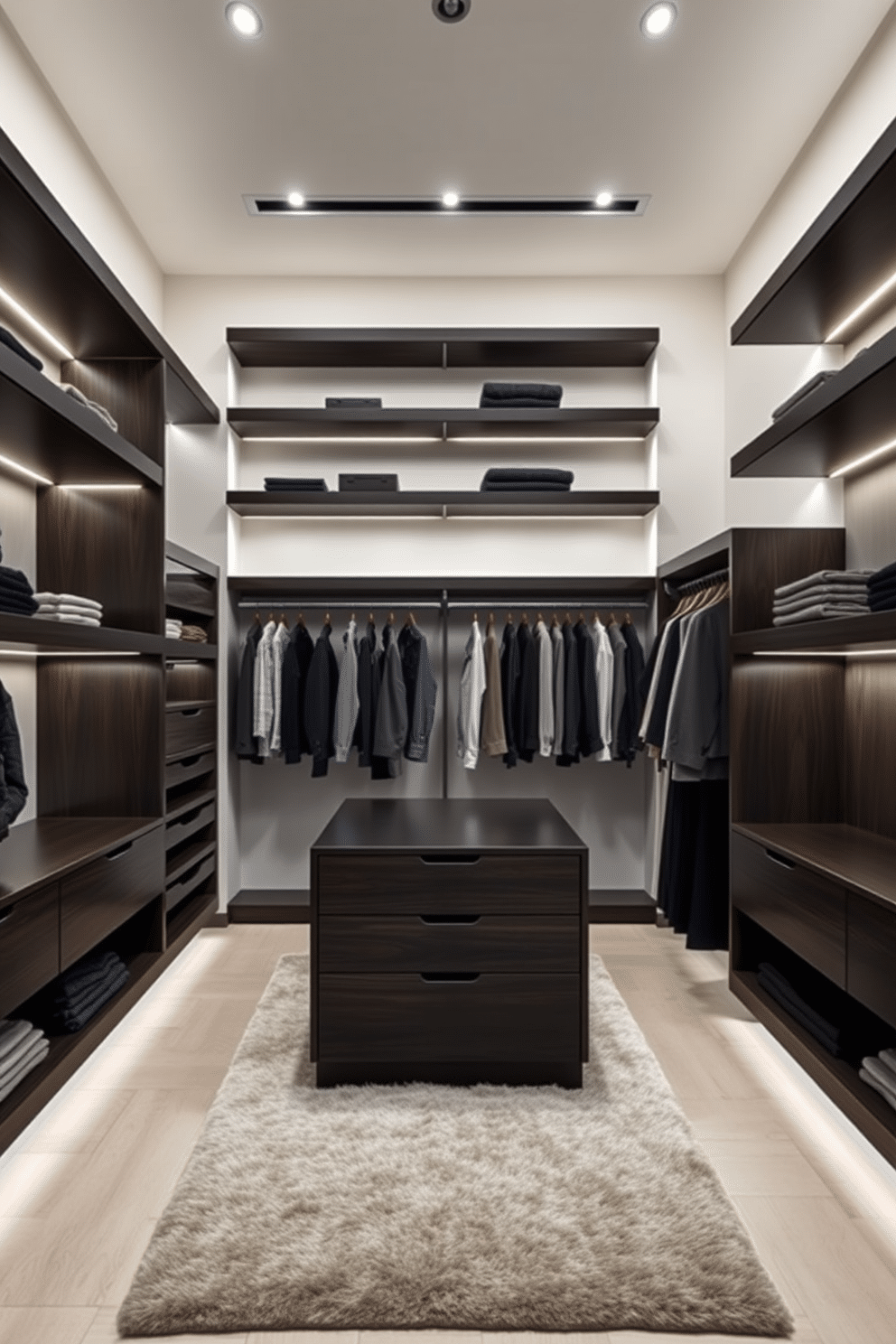 Incorporate a stylish island in the center with drawers for accessories, surrounded by organized hanging spaces. Soft LED lighting highlights the shelves and creates an inviting atmosphere, making the closet both functional and chic.