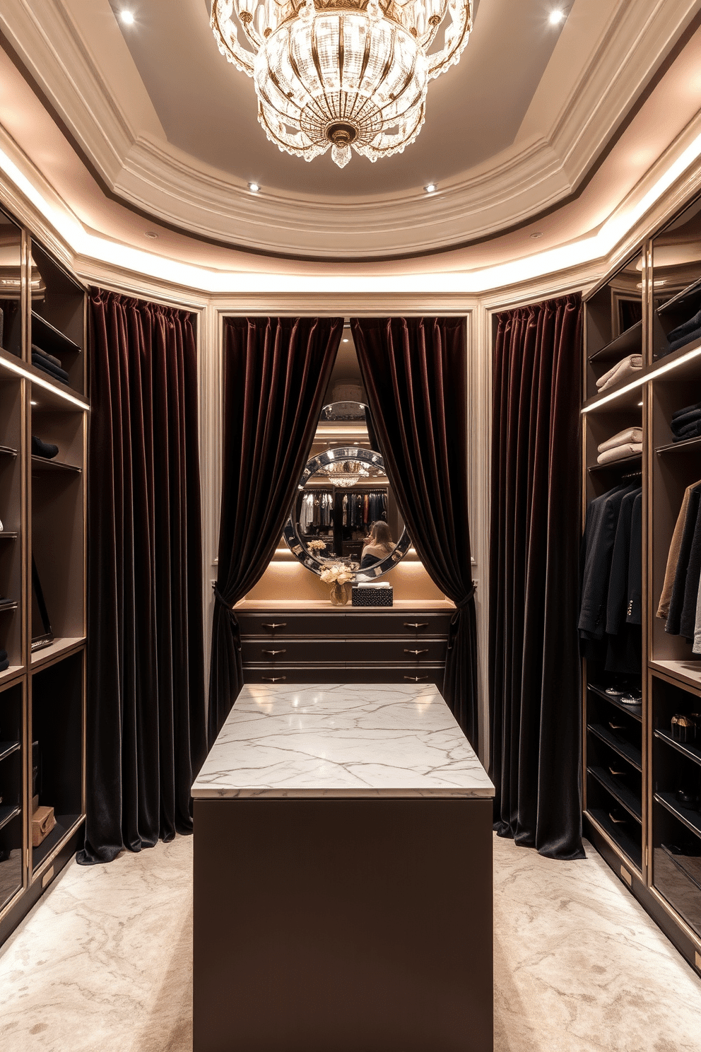 A luxurious walk-in closet featuring plush velvet curtains in a rich jewel tone that adds a chic touch to the space. The closet is organized with elegant shelving, a central island with a marble top, and soft ambient lighting that enhances the overall sophistication.