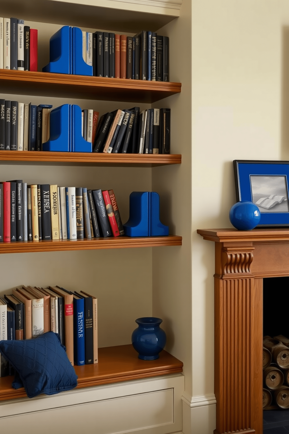 A cozy home library features stylish blue bookends elegantly displayed on wooden shelves filled with an assortment of books. The walls are painted in a soft cream color, creating a warm contrast with the deep blue accents throughout the room.
