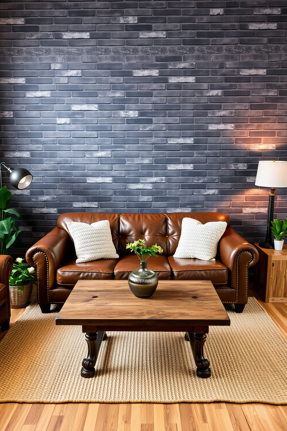 A cozy living room with charcoal brick wallpaper that exudes rustic charm. The space features a comfortable leather sofa adorned with textured throw pillows, complemented by a vintage wooden coffee table at the center.