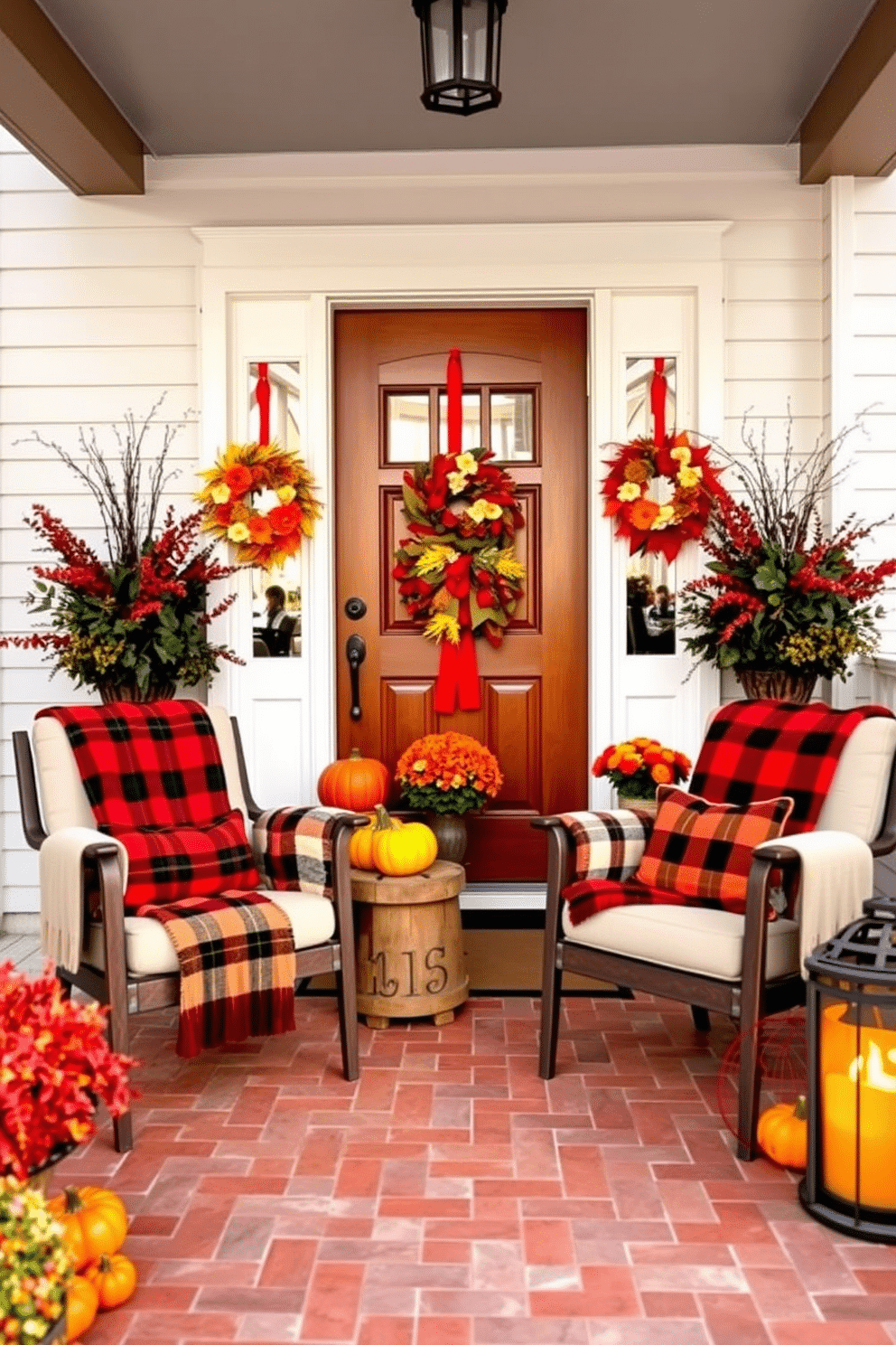 A cozy porch setting featuring plaid throw blankets draped over comfortable chairs. The entrance showcases a beautifully decorated front door adorned with autumn-themed wreaths and vibrant seasonal accents.