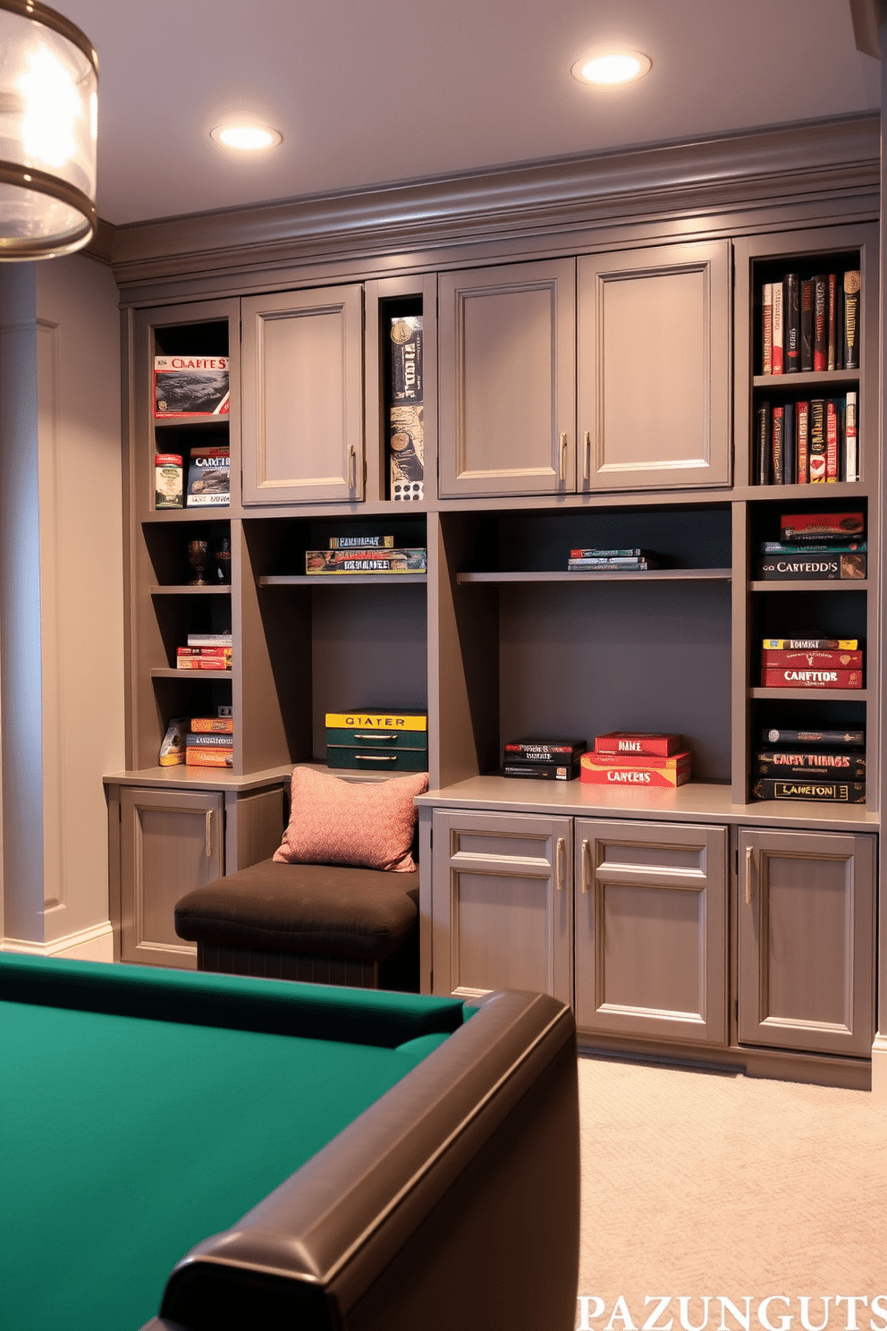 A stylish game room featuring custom-built cabinets designed specifically for board games, providing ample storage and easy access. The walls are painted in a soft gray hue, complemented by plush seating in a darker shade, creating a cozy and inviting atmosphere.