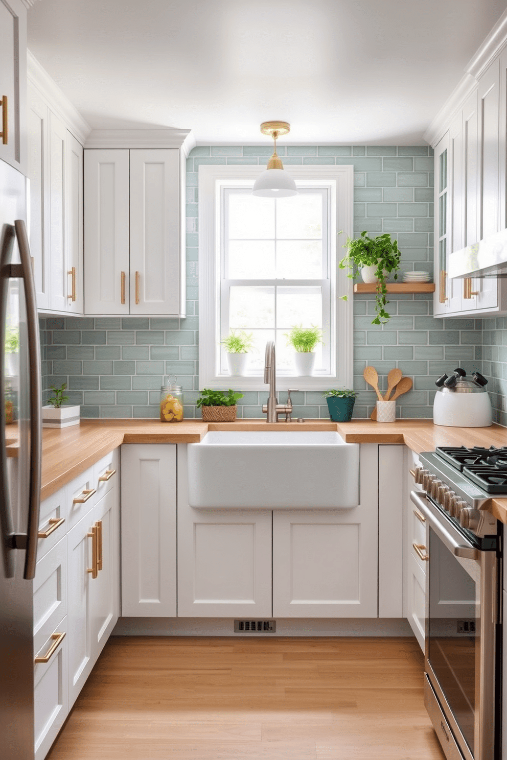 A refreshing kitchen design featuring a mint green tile backsplash, which adds a pop of color and a clean, vibrant atmosphere. The cabinets are a soft matte white, paired with a light wood countertop for warmth and balance.