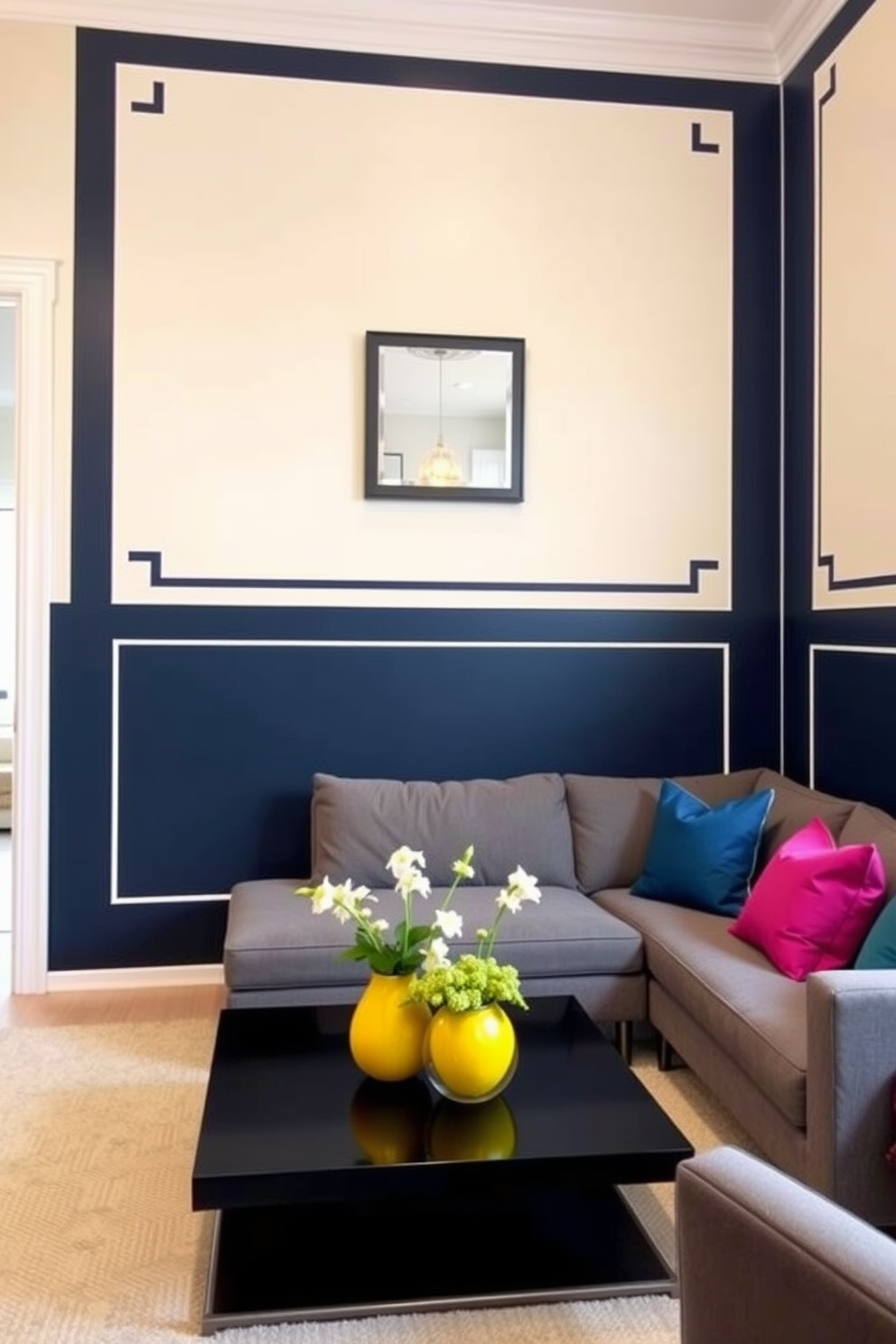 A stylish living room featuring bold borders that define painted areas. One section of the wall is painted in a deep navy blue while the adjacent area showcases a soft cream color, creating a striking contrast.