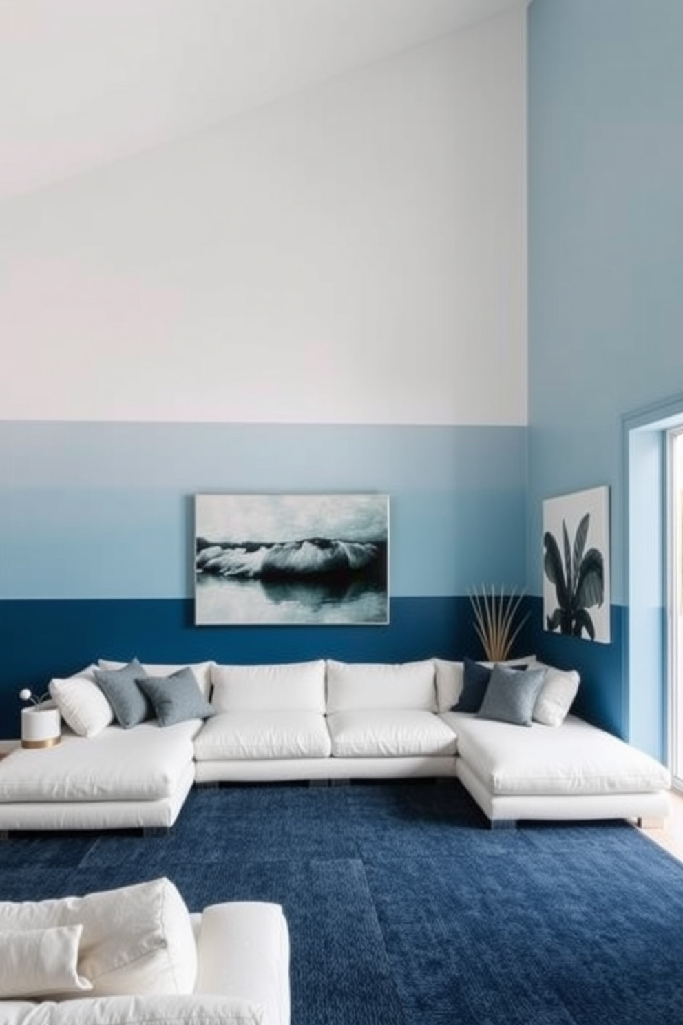 A stunning living room featuring an ombre effect wall that transitions from deep blue at the bottom to a soft sky blue at the top. The room is adorned with a plush white sofa and a large abstract painting that complements the color scheme.
