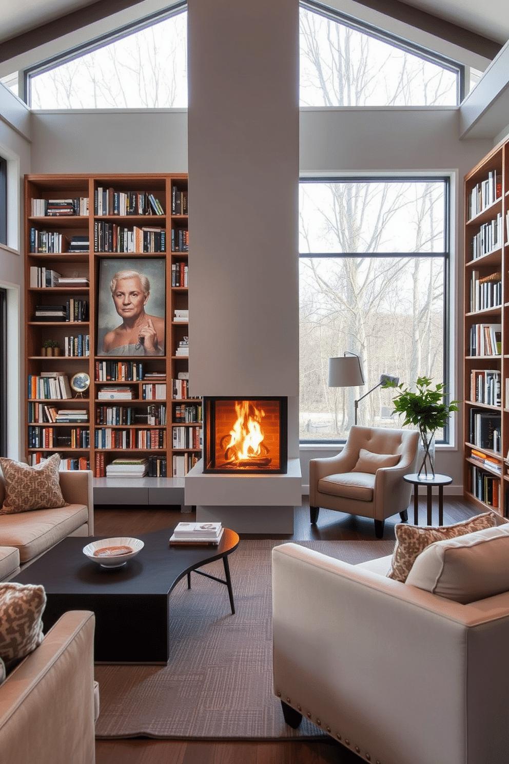 A modern fireplace with a sleek stone surround serves as the focal point, creating a warm and inviting atmosphere. Floor-to-ceiling bookshelves line the walls, filled with an eclectic mix of books and personal artifacts, while a soft area rug adds texture and warmth to the hardwood floor.