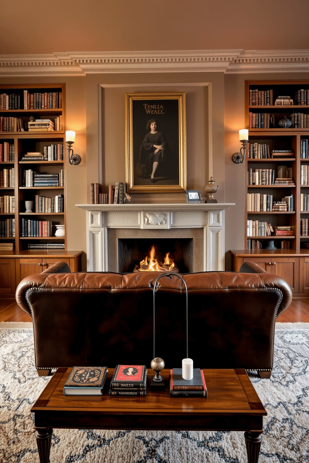 A classic leather sofa in rich brown faces a grand fireplace, framed by elegant built-in bookshelves filled with an array of books and decorative items. The walls are painted in a warm taupe, creating a cozy atmosphere, while a plush area rug adds texture underfoot.