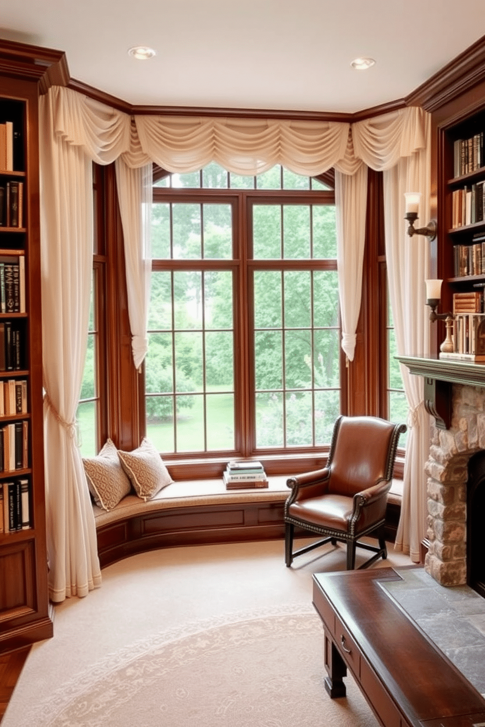 Charming window treatments enhancing the view: Elegant sheer curtains frame a large bay window, allowing natural light to flood the room while offering a soft, airy feel. The window seat below is adorned with plush cushions, creating a cozy nook that invites relaxation and offers a picturesque view of the garden outside.