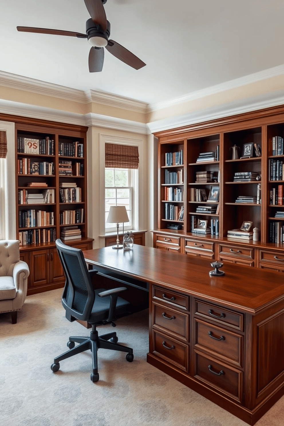 A spacious home office library features a large wooden desk with ample storage solutions, including built-in shelves and drawers. The desk is positioned near a window, allowing natural light to illuminate the workspace, while a comfortable ergonomic chair complements the setup.