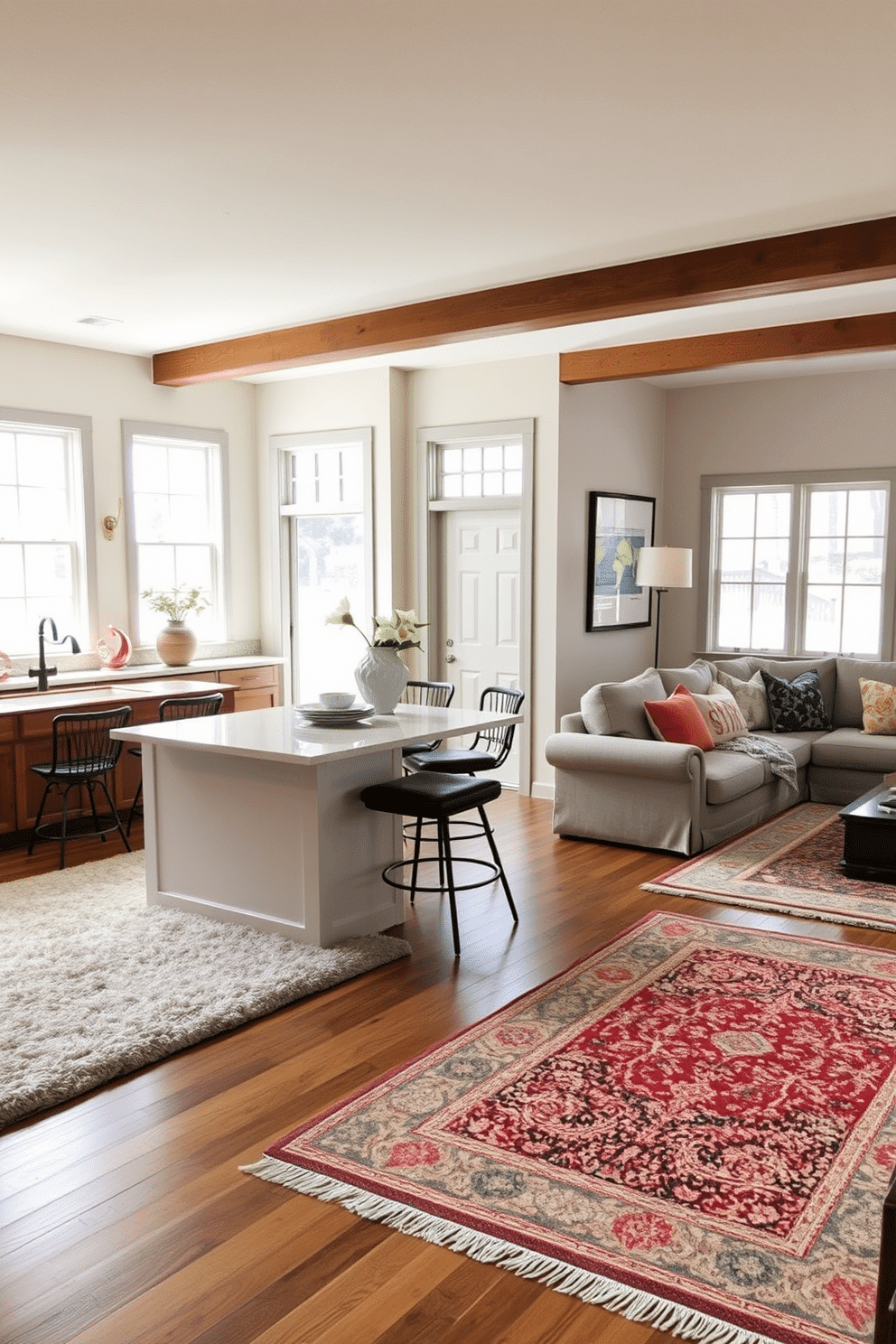 A cozy kitchen-family room combo features a large, plush area rug that anchors the seating area, creating a warm and inviting atmosphere. The kitchen island, topped with a beautiful quartz countertop, is complemented by stylish bar stools that invite casual dining and conversation.