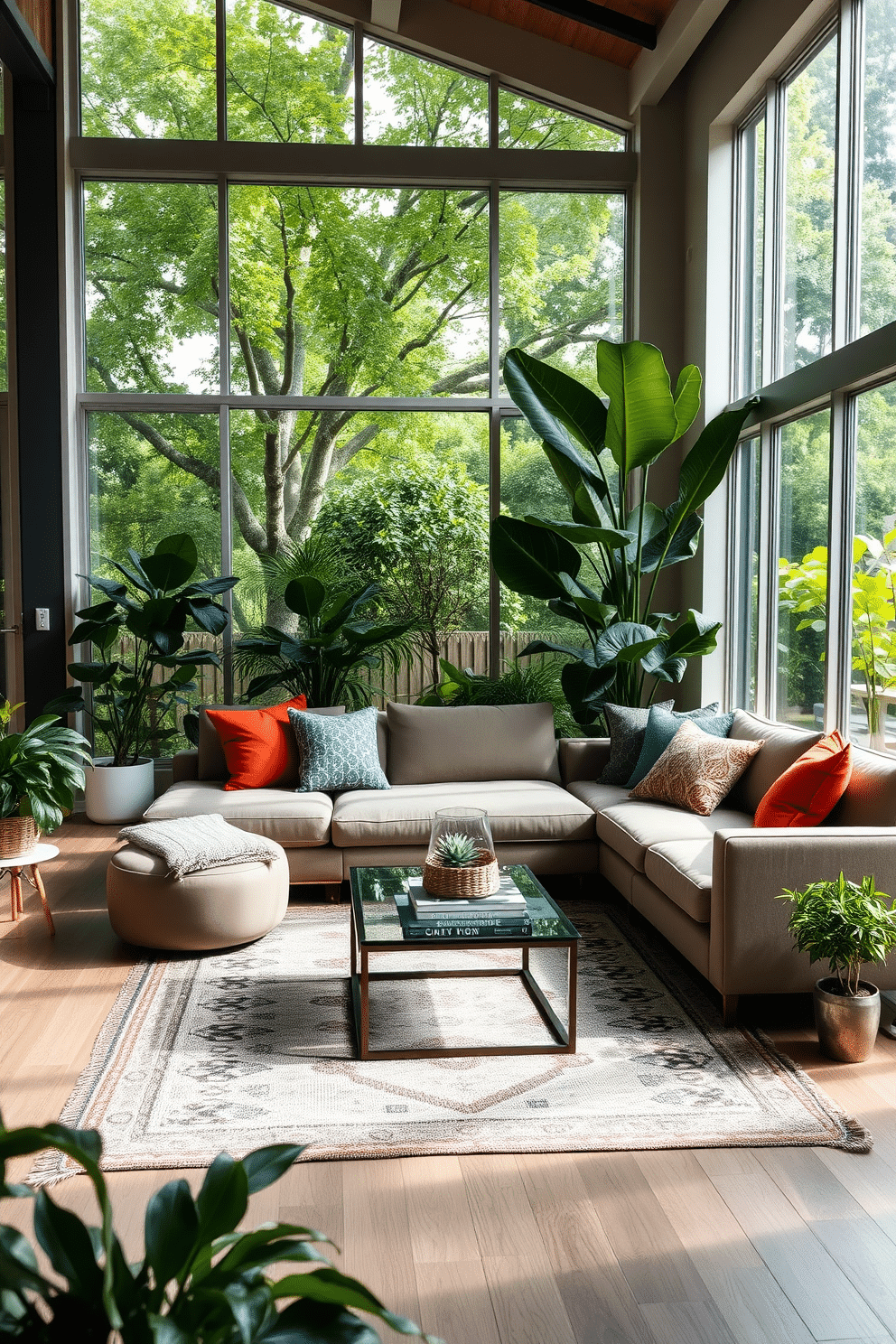 A spacious living room filled with natural light from large floor-to-ceiling windows that frame a stunning view of the outdoors. The room features a plush sectional sofa in a soft gray fabric, complemented by a mix of colorful throw pillows and a stylish coffee table at the center.