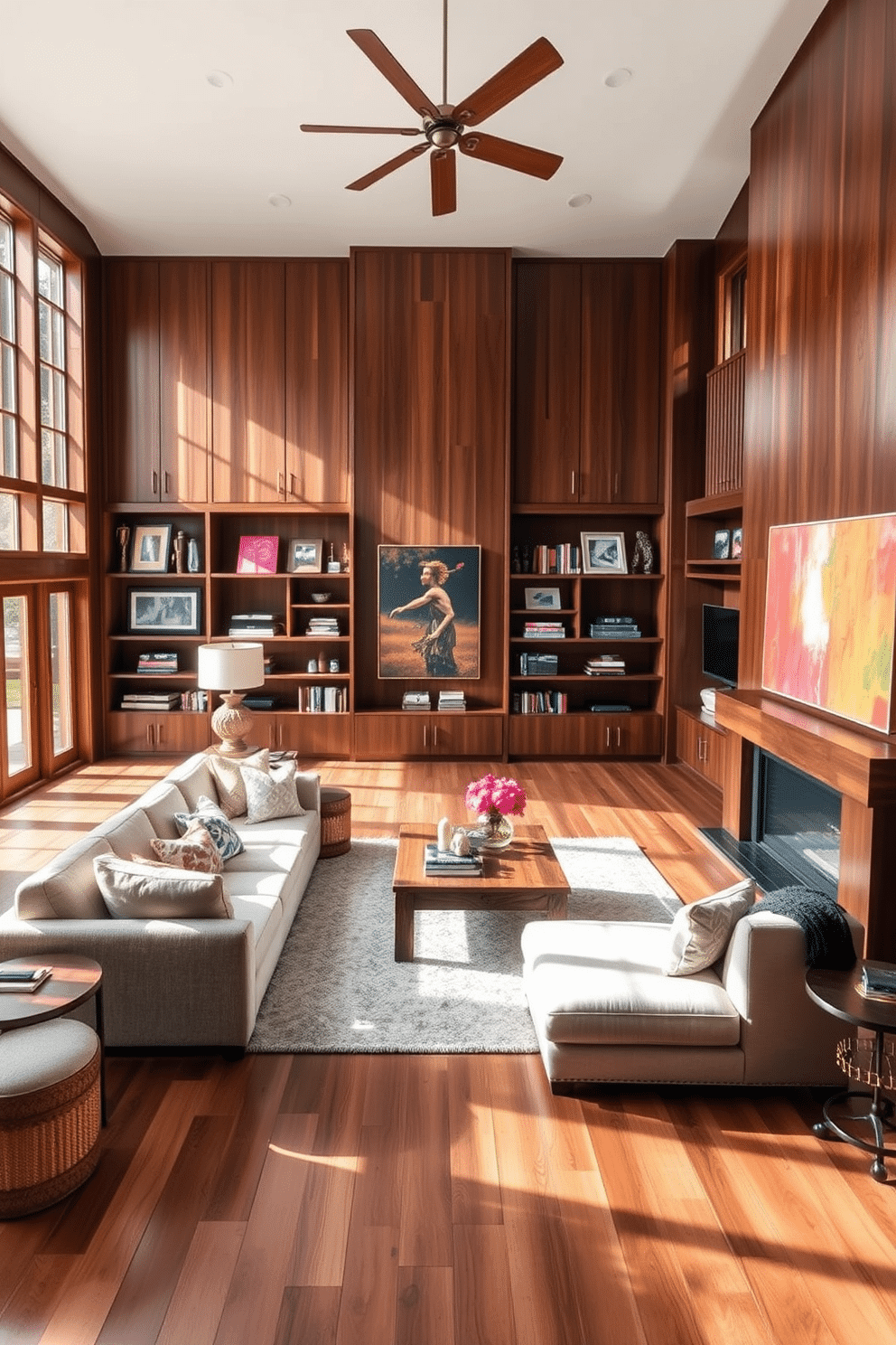 A spacious living room featuring custom cabinetry that seamlessly integrates with the overall design. The cabinetry is crafted from rich wood with a glossy finish, providing ample storage while enhancing the room’s elegance.