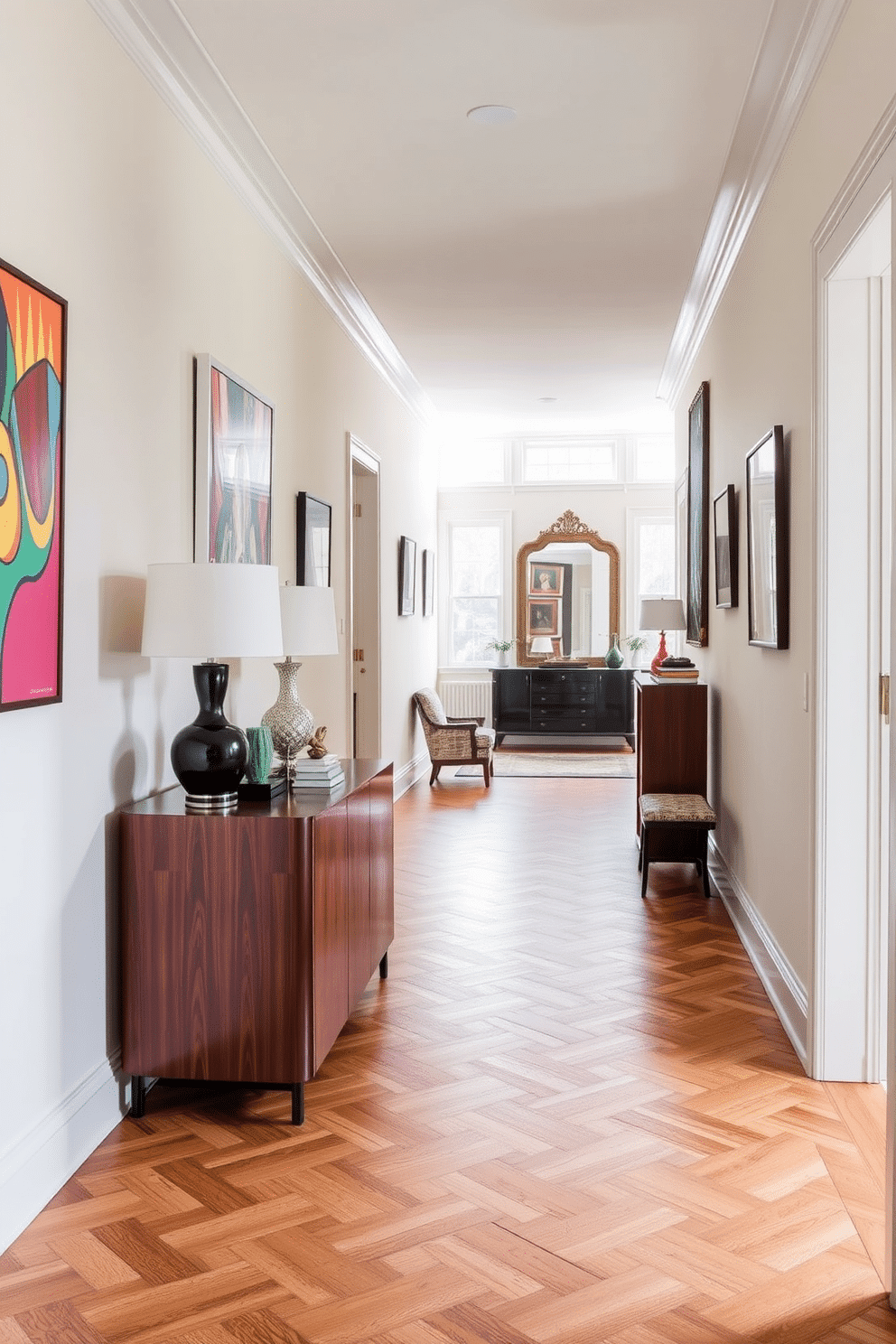 A sleek console table in a rich walnut finish sits against one wall, topped with decorative items and a stylish lamp. The floor features elegant herringbone-patterned wood, leading the eye towards a statement mirror at the far end.