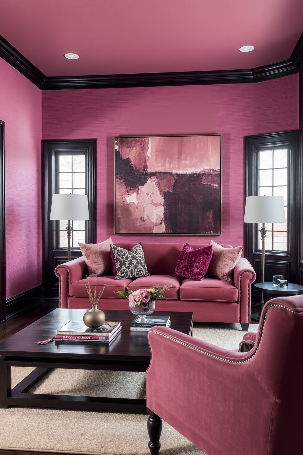 A chic living room featuring mauve walls that create a warm and inviting atmosphere. The room is accented with charcoal furniture pieces, including a plush sofa and sleek coffee table, enhancing the sophisticated color palette.