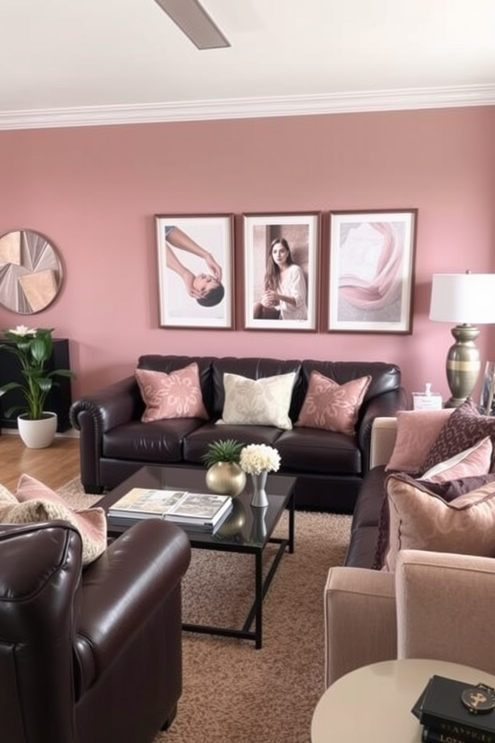 A cozy living room featuring soft mauve walls that create a warm and inviting atmosphere. In the center, there are plush dark leather seating options that provide a striking contrast against the gentle hues of the walls.