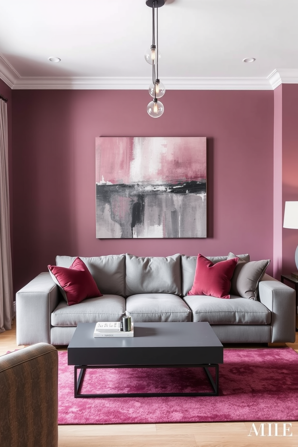 A modern living room featuring mauve walls that create a warm and inviting atmosphere. The furniture includes a plush grey sofa with sleek lines, complemented by mauve accent pillows and a stylish grey coffee table.