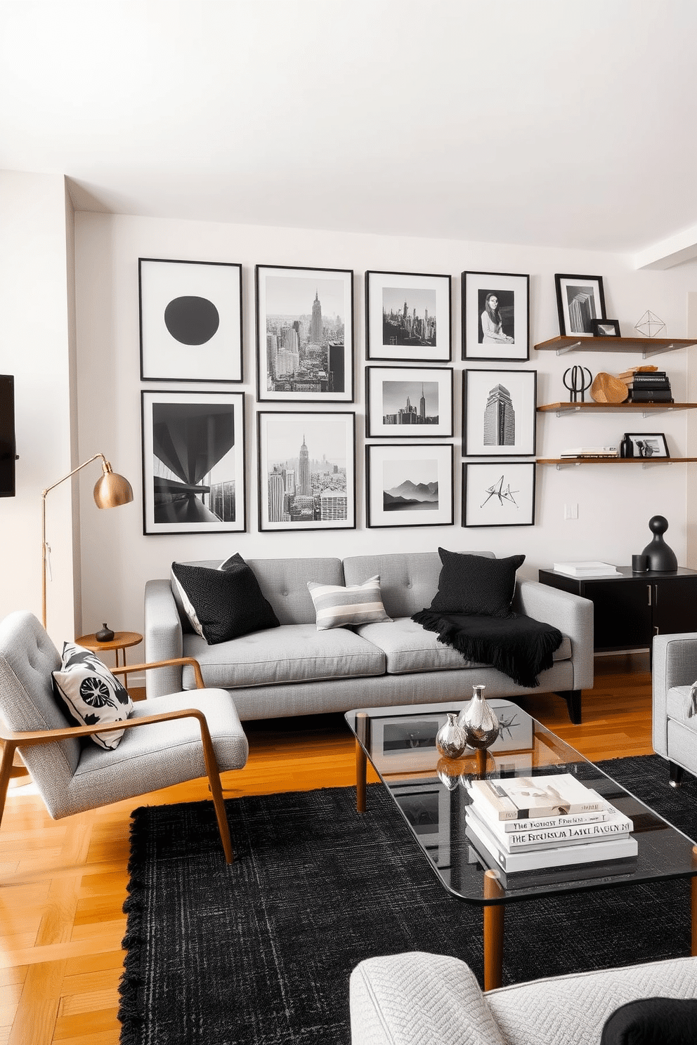 A sleek and modern living room showcasing a gallery wall of black-and-white prints. The prints feature a mix of abstract shapes, cityscapes, and portraits, each framed in thin black frames that contrast against a soft white wall. Beneath the gallery wall, a low-profile gray sofa is adorned with monochrome throw pillows, while a glass coffee table sits atop a textured black rug.