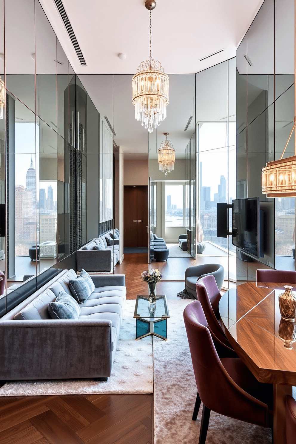 A modern dining area in a NYC apartment featuring floor-to-ceiling mirrored panels that amplify light and add depth to the narrow space. The setting includes a wooden dining table with velvet chairs, warm ambient lighting from a statement chandelier, and a backdrop of mirrored walls enhancing the urban sophistication.
