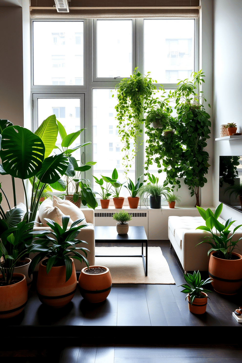 A vibrant urban apartment filled with natural light, where lush indoor plants breathe life into the space. A mix of monstera, fiddle leaf fig, and cascading pothos is artfully arranged in modern terracotta planters, enhancing the contemporary setting.