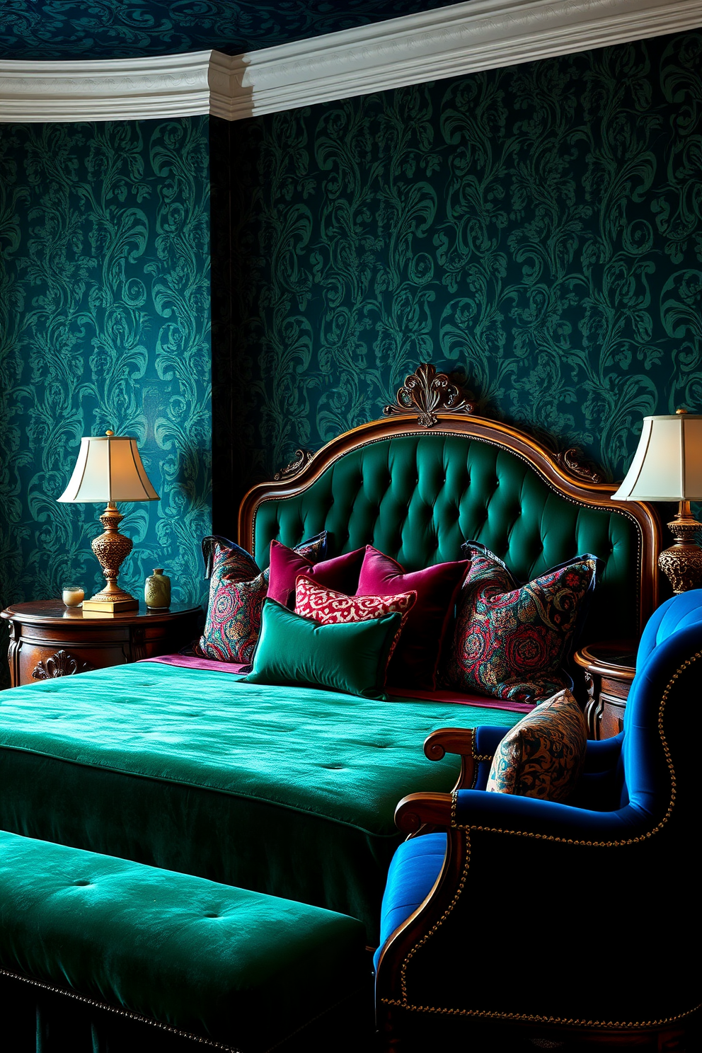 A luxurious bedroom adorned with rich jewel-toned paisley wallpaper that adds depth and character to the space. The room features a plush velvet bedspread in deep emerald green, complemented by an array of decorative pillows in various jewel tones.