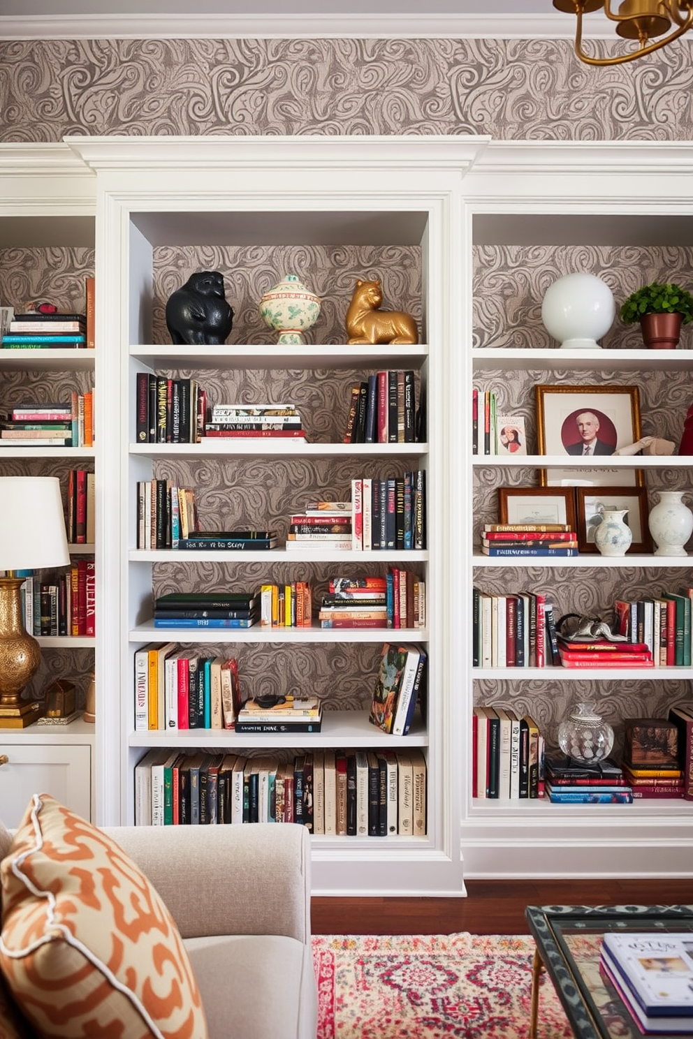 A beautifully designed living space featuring paisley wallpaper behind open shelving units. The shelves are filled with an eclectic mix of books and decorative items, creating a vibrant and inviting atmosphere.