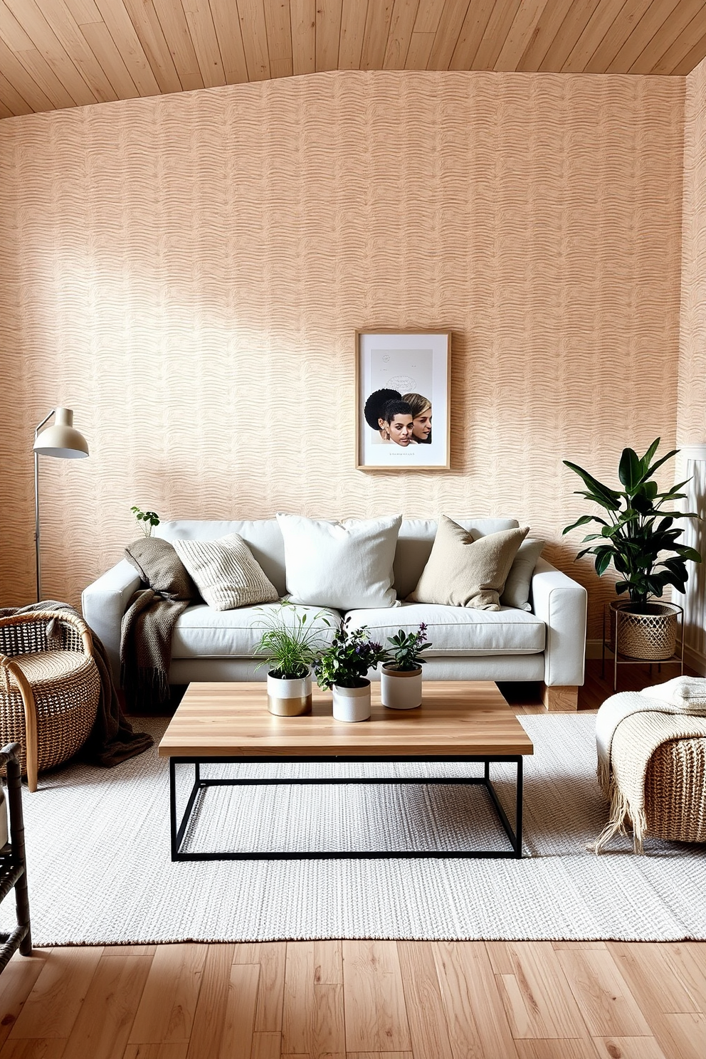 A cozy Scandinavian living room featuring light wood textures that create a sense of natural warmth. The walls are adorned with soft, patterned wallpaper that enhances the inviting atmosphere.