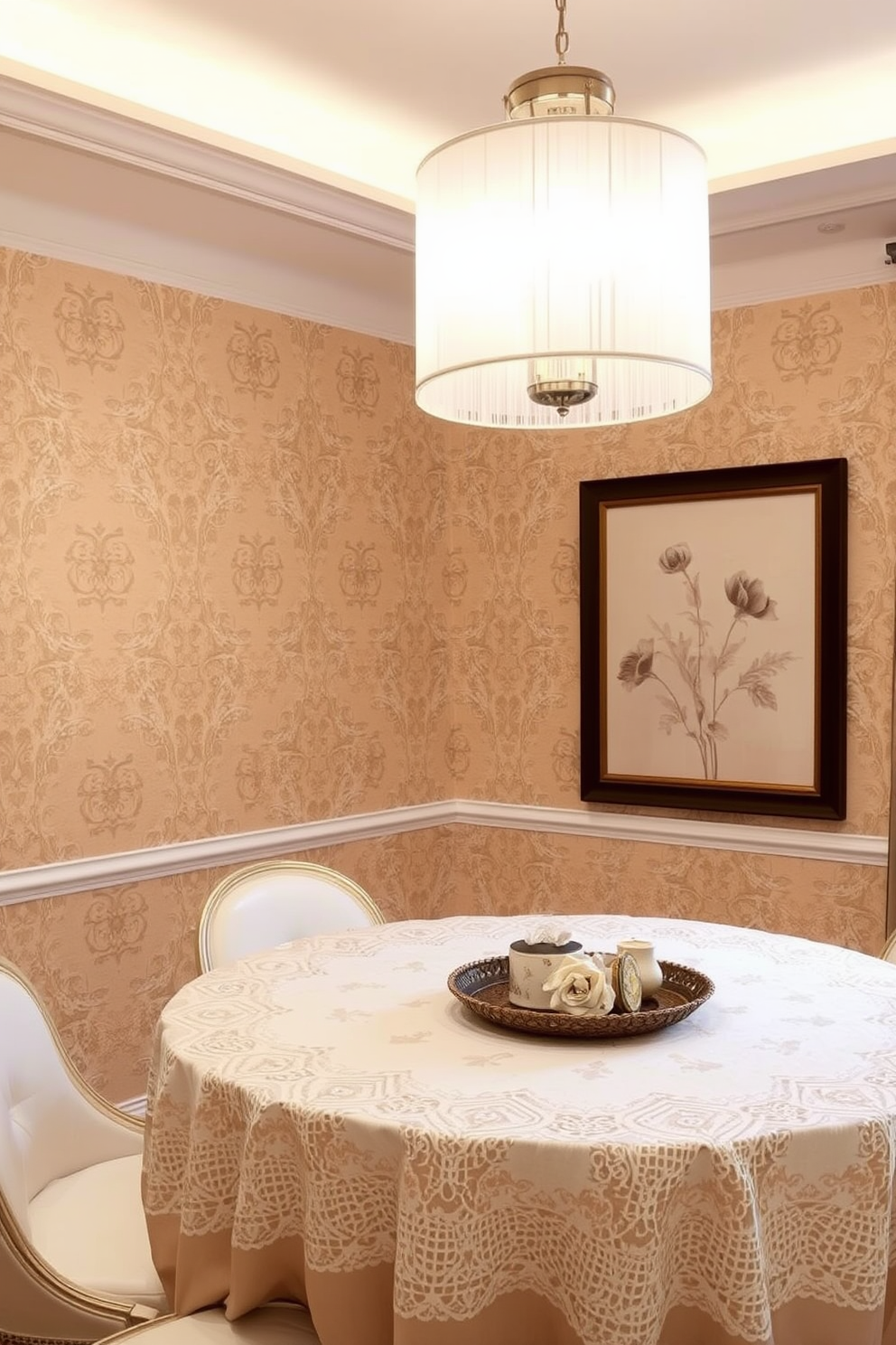 Elegant sepia lace patterns create a soft and feminine ambiance. The walls are adorned with intricate sepia-toned lace designs that evoke a sense of vintage charm.