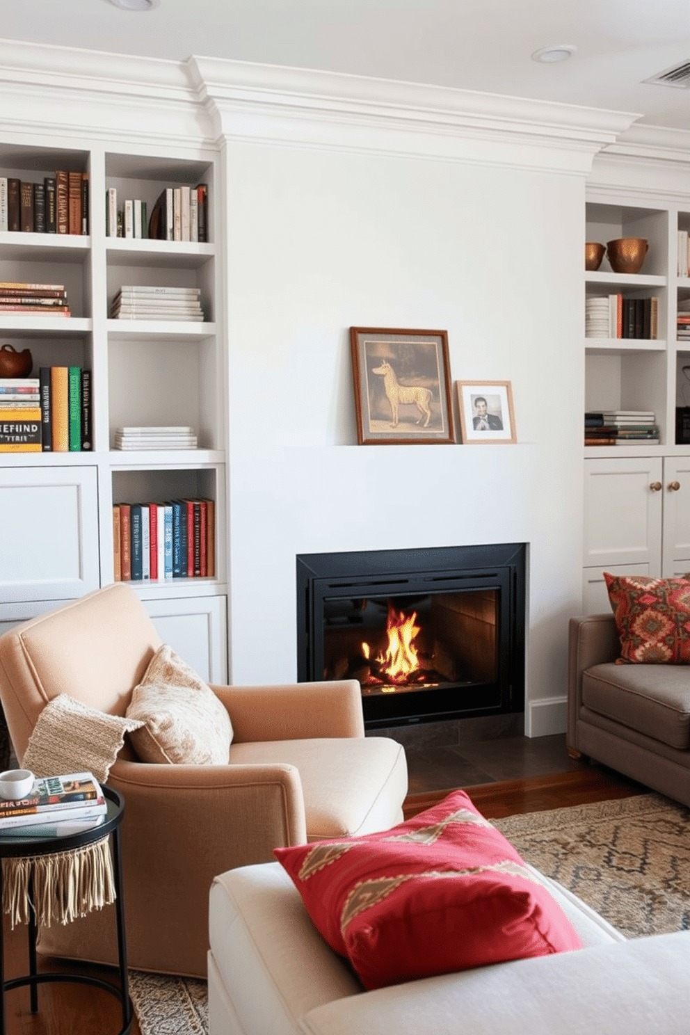 A cozy small living room featuring built-in shelving units that flank a modern fireplace. The shelves are filled with an array of books and decorative items, while a plush sofa faces the fireplace, creating an inviting focal point.