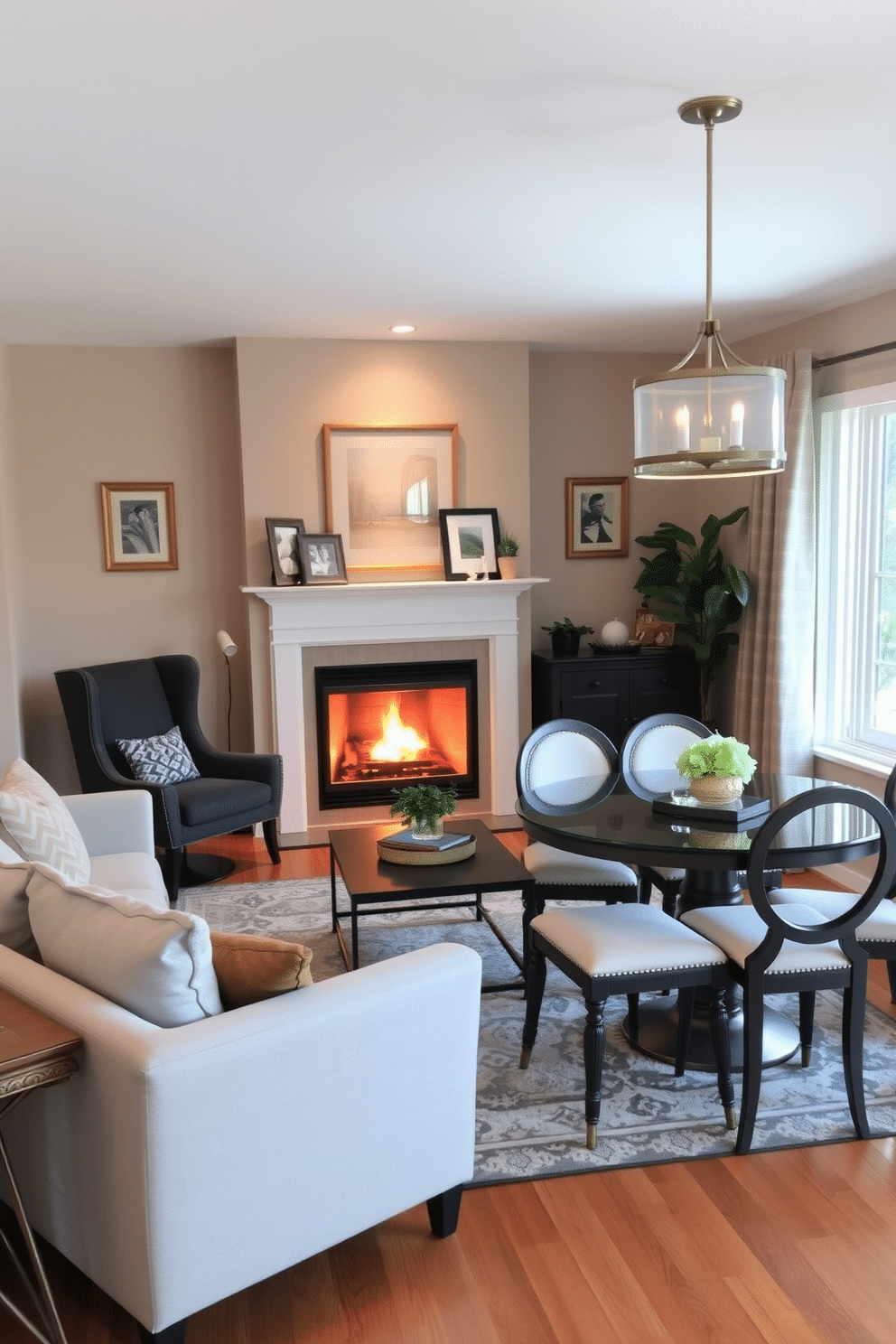 A cozy small living room features a warm, inviting fireplace as the focal point, surrounded by a stylish mantel adorned with decorative items. A plush area rug defines the space, while a comfortable sofa and accent chairs are arranged to encourage conversation.