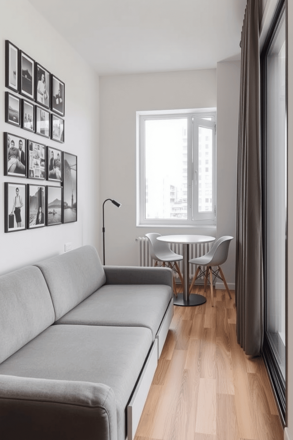 Above the sofa, a vertical gallery wall displays a mix of black-and-white photographs in slim frames. Adjacent to the seating area, a compact round dining table with two minimalist chairs sits near a large window, allowing natural light to flood the space.