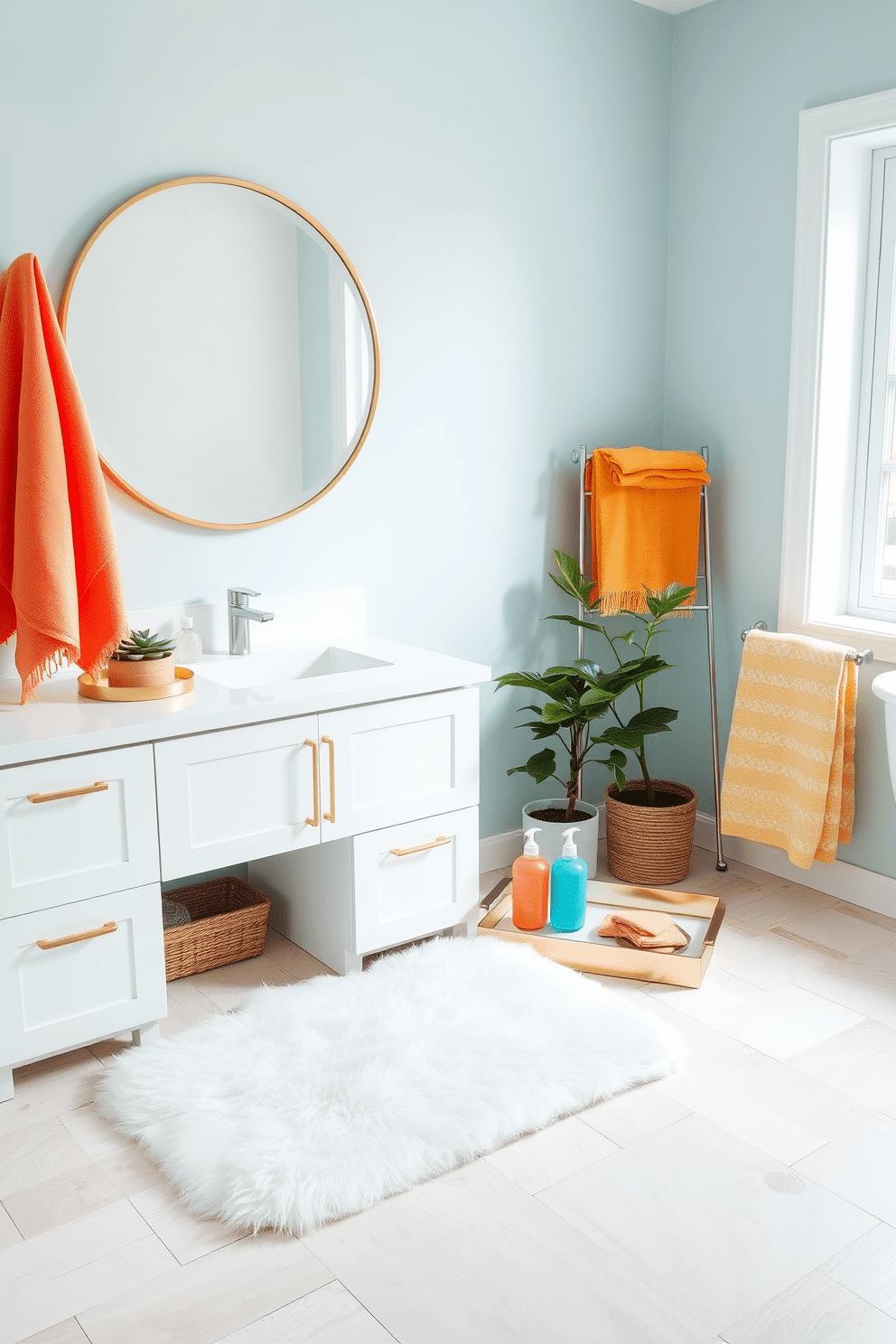 A fluffy white bath mat adds a touch of comfort in front of the sink. Freshly folded towels in vibrant colors hang neatly on a rack, bringing a cheerful vibe to the space.