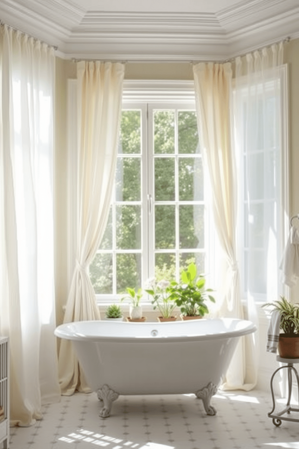 A bright and cheerful bathroom adorned with light and airy fabrics for curtains. The curtains gently billow in the breeze, allowing soft sunlight to filter through and illuminate the space.