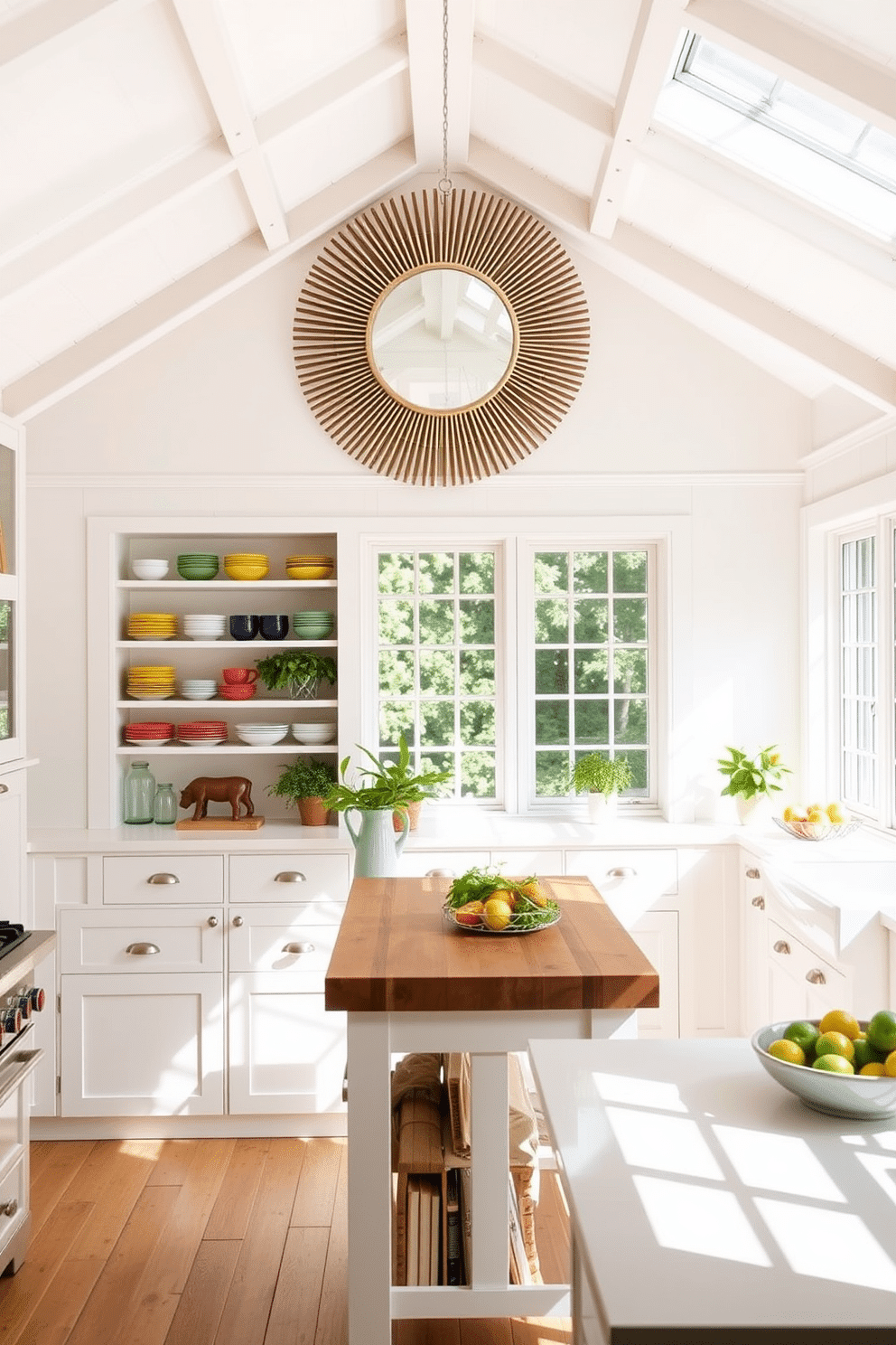 Above the island, a sunburst mirror reflects the sunlight, enhancing the airy atmosphere. Colorful dishware and fresh herbs are displayed on open shelves, adding a touch of vibrancy.