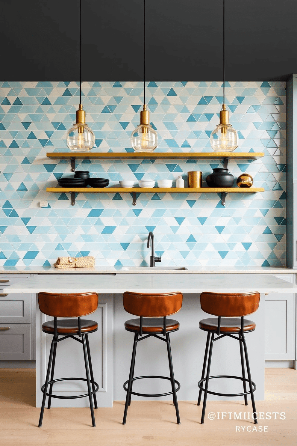 A vibrant and stylish kitchen with geometric wall tiles in a mix of soft blues and whites, creating a playful yet tasteful backdrop. Matte brass shelving is mounted onto the tiled walls, serving as both functional storage and a chic display for decorative ceramics and glassware.