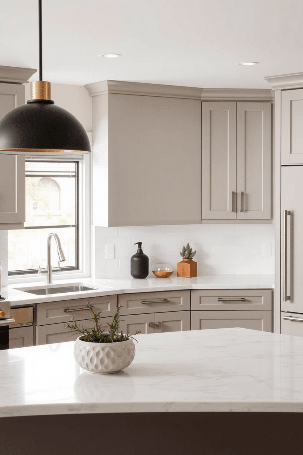A modern townhouse kitchen with sleek, minimalist design. Statement pendant lighting in matte black and brass finishes hangs gracefully above white marble countertops, creating a striking focal point. Soft taupe cabinetry pairs seamlessly with brushed nickel hardware, while a white subway tile backsplash reflects natural light. A hint of greenery in a ceramic pot decorates the island, adding a fresh, organic touch to the sophisticated space.