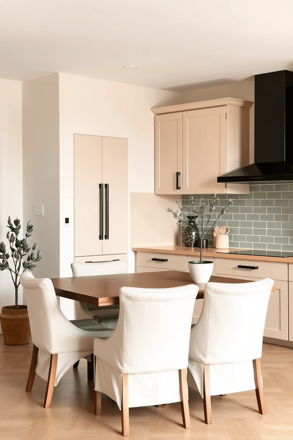 The countertop is a warm quartz in a sandy shade, paired with a matte green tiled backsplash to add a subtle nod to nature. A wooden dining table is surrounded by off-white upholstered chairs, and a potted olive tree sits nearby to enhance the organic feel of the space.