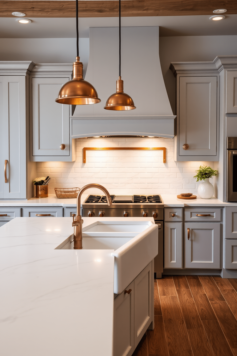 A warm and inviting kitchen space with copper accents throughout. Sleek copper handles adorn light gray cabinets, while a timeless farmhouse sink is paired with a gleaming copper faucet.