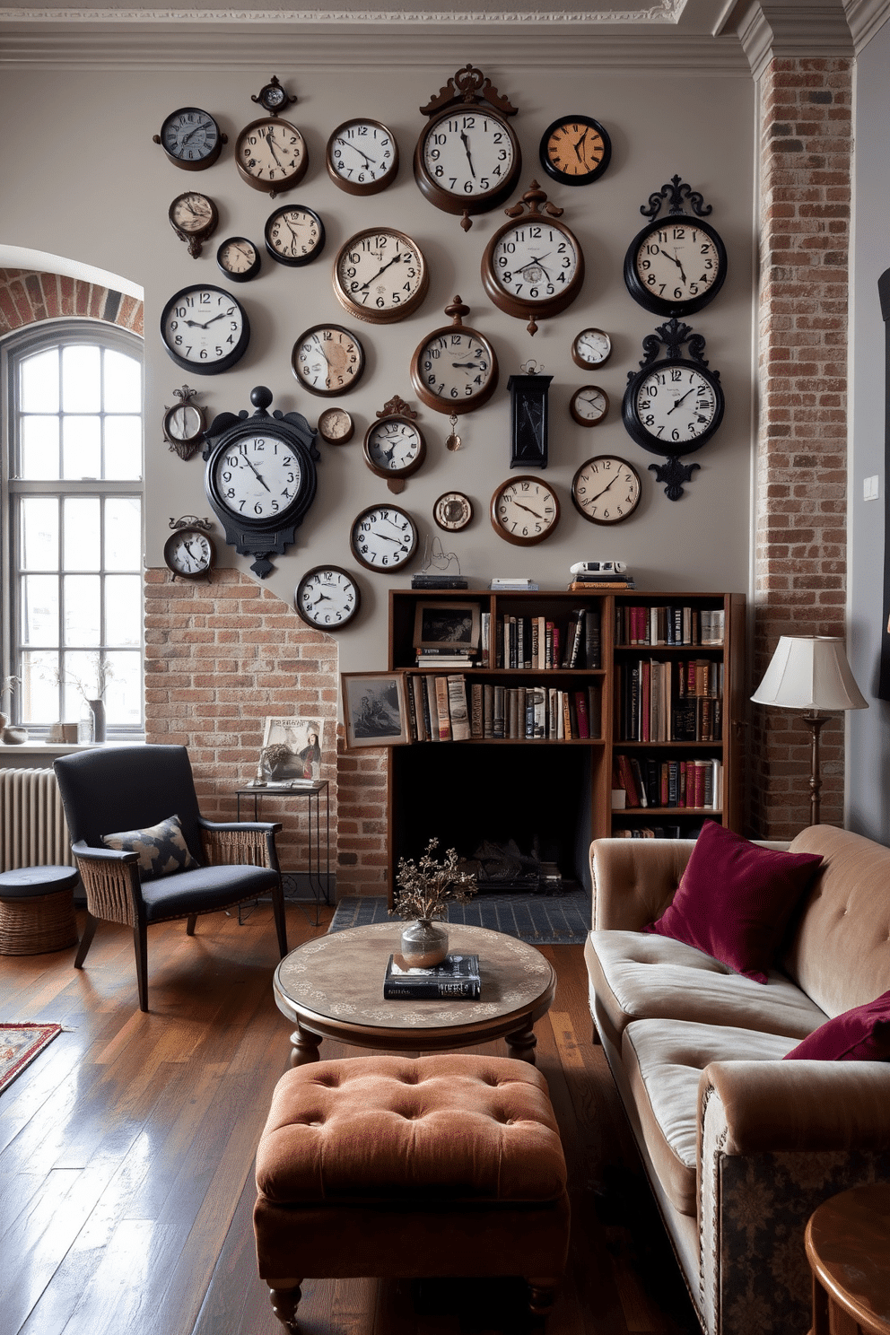 A collection of antique clocks adorns a feature wall, creating a captivating display of intricate craftsmanship and timeless charm. Each clock, varying in size and design, is carefully arranged to balance harmony and visual interest against a backdrop of soft cream or muted grey paint. A vintage apartment filled with character features restored wood floors and exposed bricks paired with mid-century furniture. Brass accents, plush velvet upholstery, and an open bookshelf filled with vintage books complete the look, exuding a nostalgic yet refined ambiance.