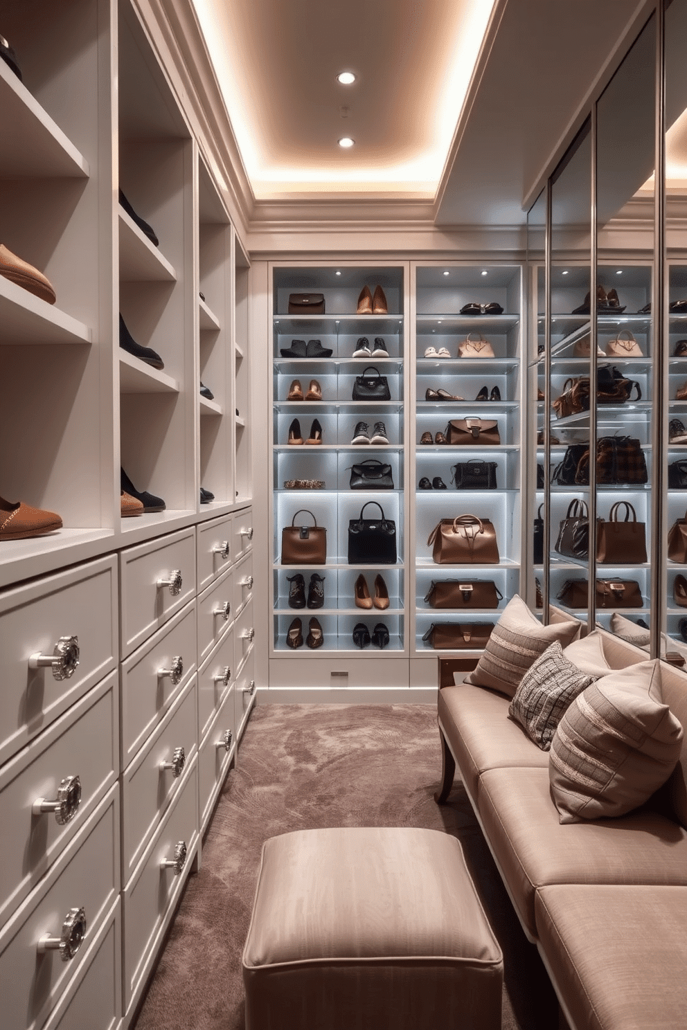 A luxurious walk-in closet featuring elegant crystal knobs on sleek, white drawers. The space is illuminated by soft, ambient lighting that highlights the organized shelves filled with designer shoes and handbags.