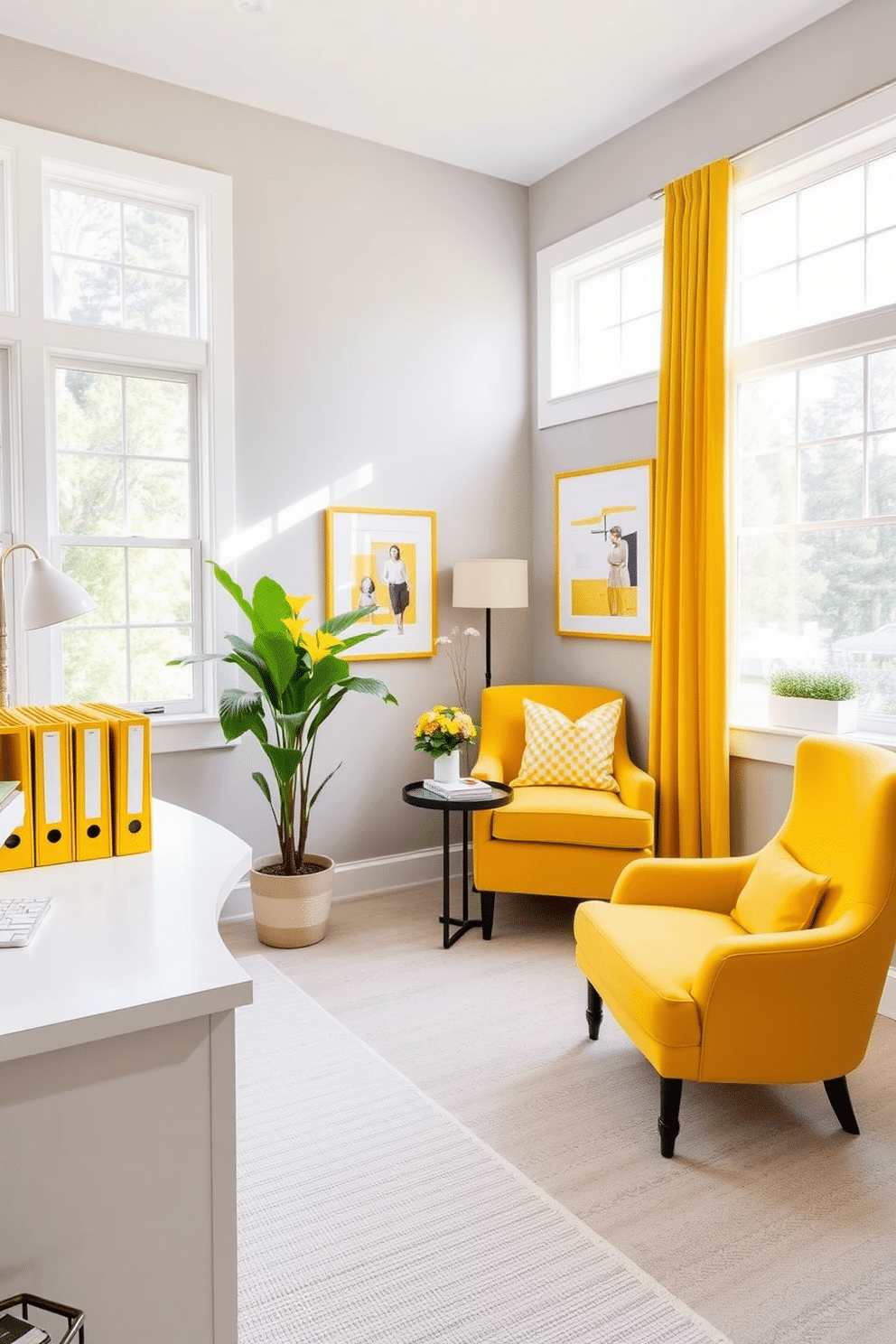 A bright and cheerful home office features yellow file organizers neatly arranged on a sleek white desk, providing both functionality and a pop of color. The walls are painted in a soft gray shade, creating a modern backdrop that complements the vibrant yellow accents.