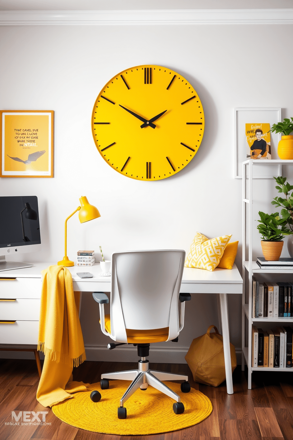 A bright yellow clock serves as a striking focal point in the home office, adding a cheerful pop of color against a neutral backdrop. The workspace features a sleek white desk paired with a comfortable ergonomic chair, while the walls are adorned with inspirational artwork that complements the vibrant clock.