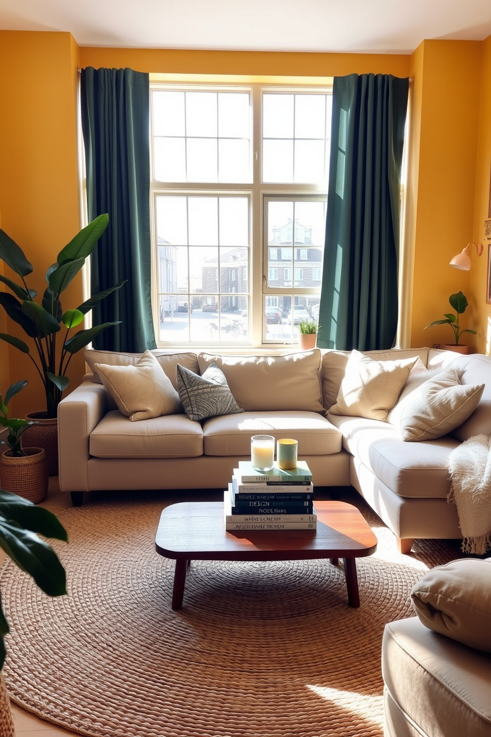 A cozy living room setting with warm honey yellow walls that invite relaxation and comfort. The space features a plush beige sofa adorned with soft throw pillows, and a wooden coffee table sits in the center, topped with a stack of design books and a decorative candle.