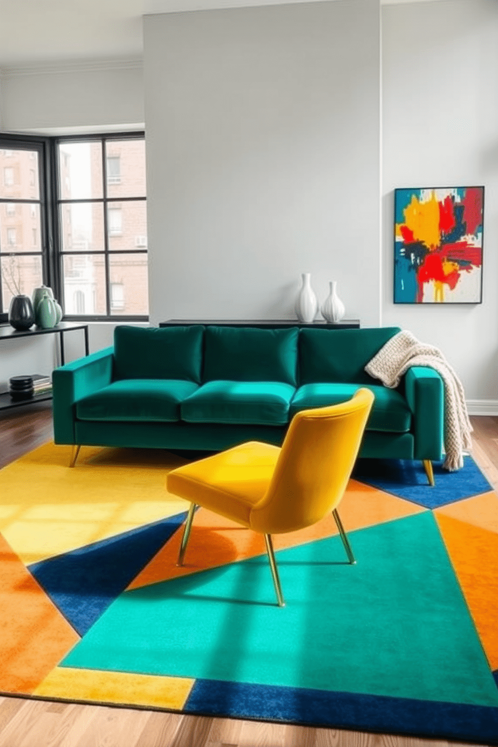 A vibrant apartment living space featuring a geometric rug in striking hues of mustard yellow, navy blue, and burnt orange. Centered on the rug is a contemporary velvet sofa in deep emerald green, accompanied by a mustard accent chair with sleek gold legs.