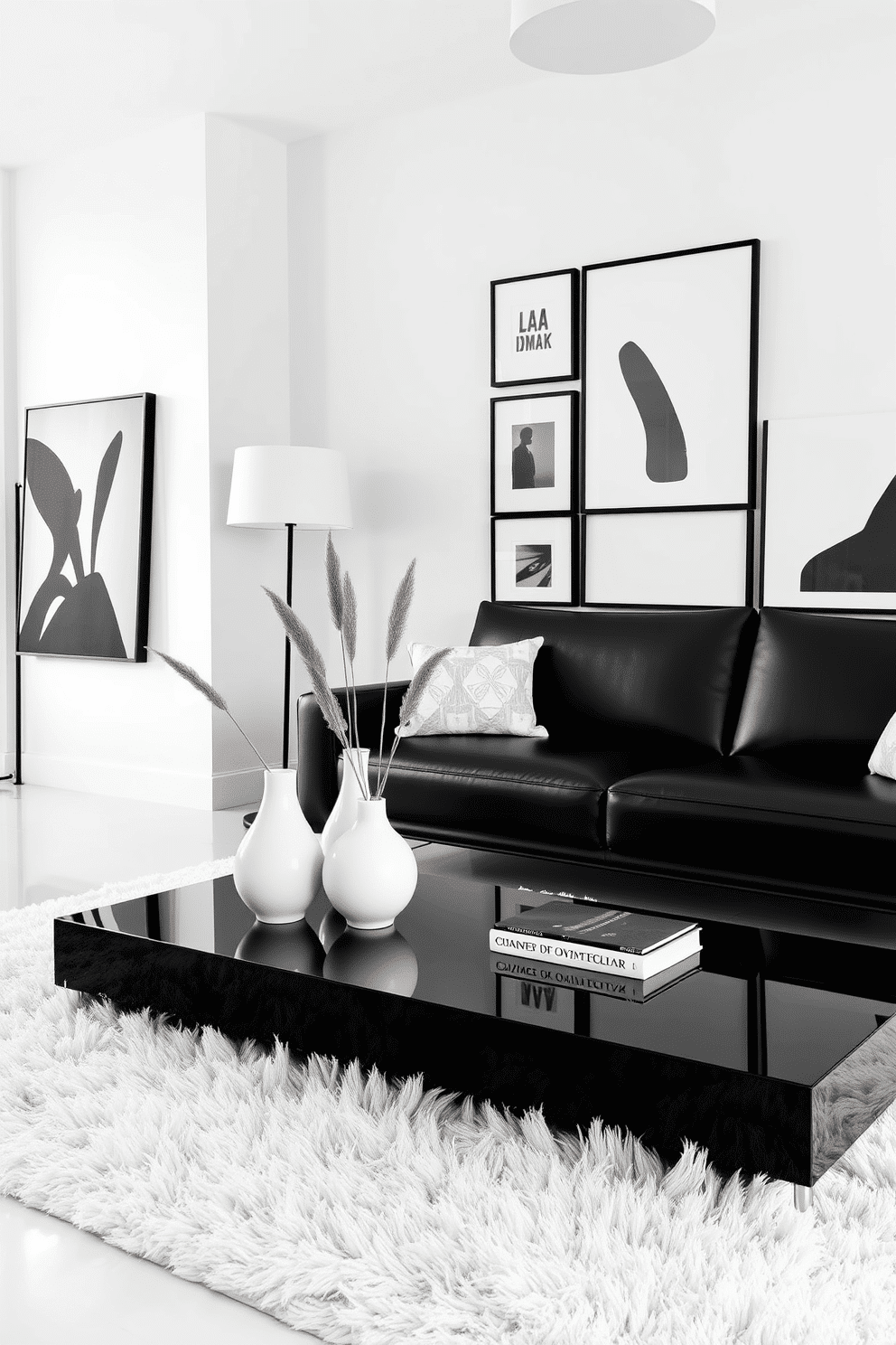 The coffee table is glossy black with sculptural details, complemented by tall white vases holding natural dried grasses. In the corner, a matte black floor lamp with a bold white shade casts ambient light, while a monochrome gallery wall adds a sense of artistic sophistication.