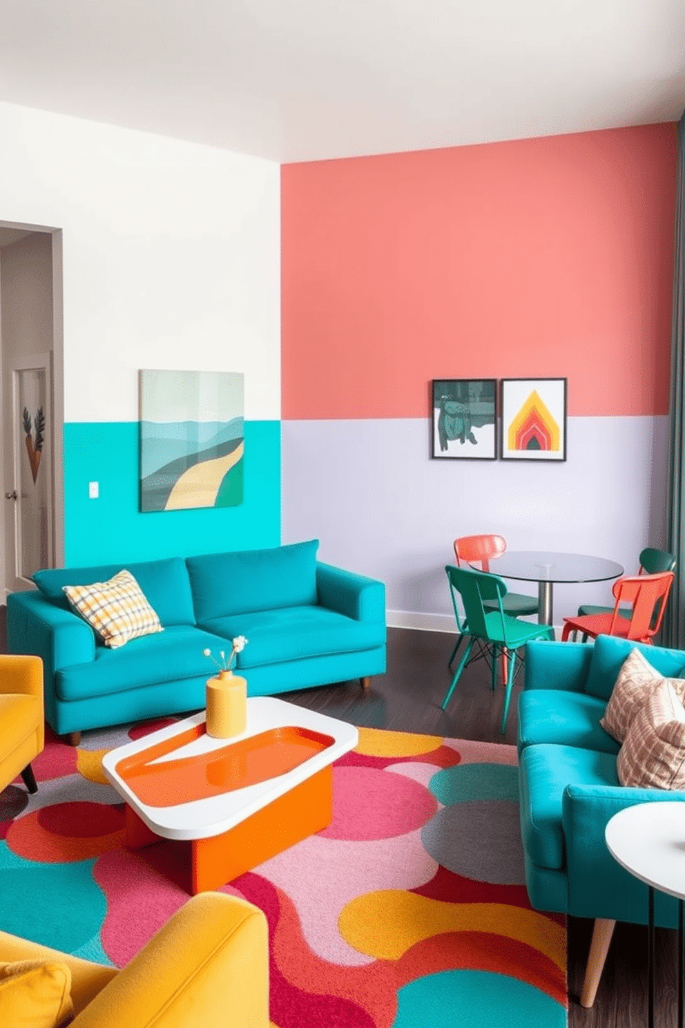 A youthful living room that embraces color-blocking for playful modernity. Vibrant turquoise and mustard yellow tones are used for furniture, with a plush turquoise sectional sofa and mustard armchairs, while the walls are painted half white and half soft coral. The coffee table is a sleek white design with bright orange geometric accents, tied together with a bold patterned rug blending various shades of teal, pink, and yellow.