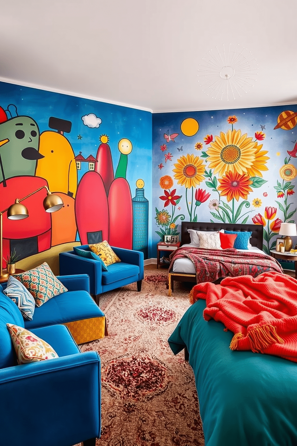In a cozy apartment bedroom, the walls are adorned with radiant, hand-painted floral and celestial motifs that exude creativity and charm. A modern low-profile bed with bright, textured throws and mismatched side tables ensures the perfect fusion of artful expression and everyday comfort.