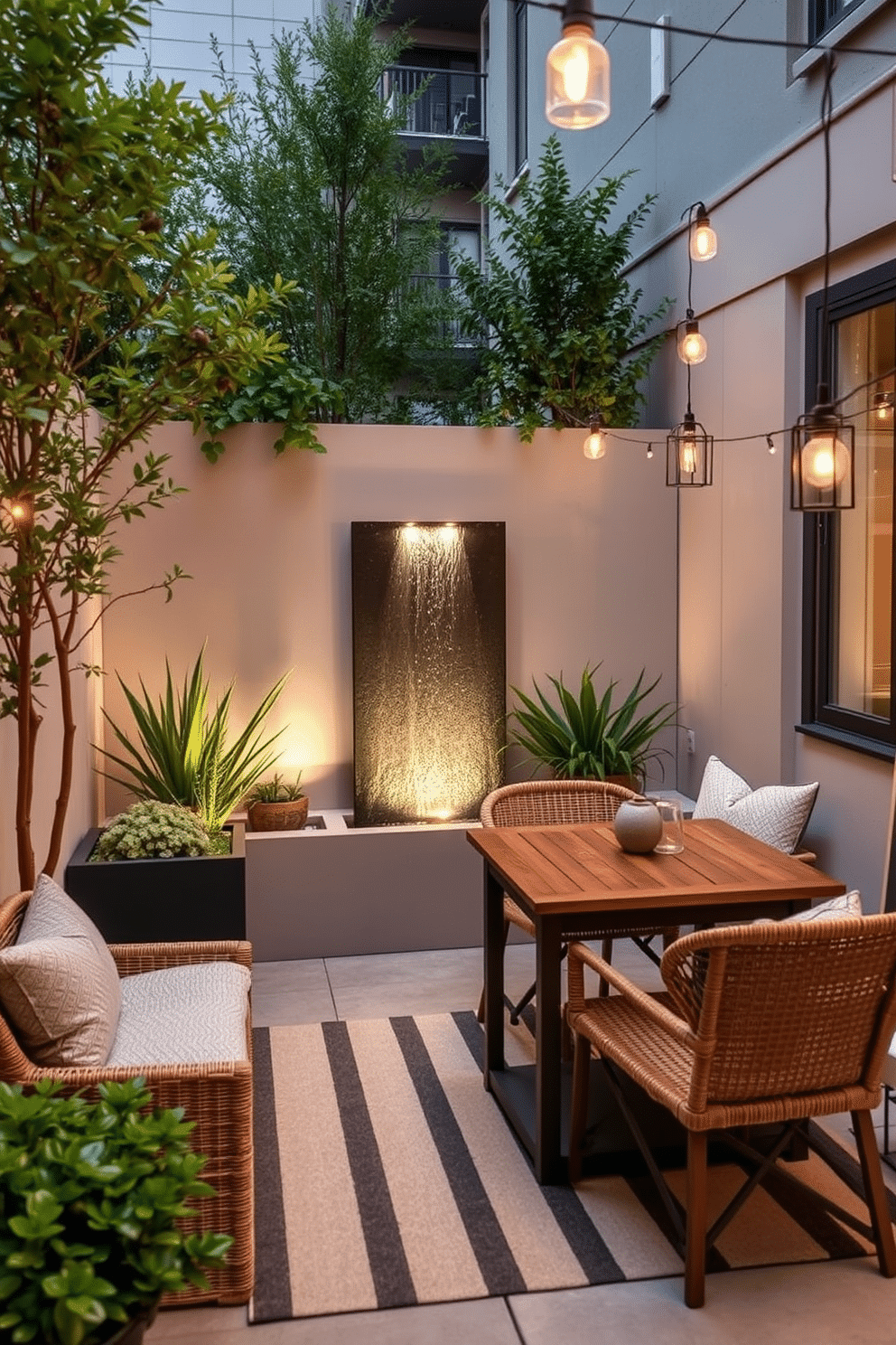 A serene apartment patio design featuring a sleek water feature nestled in the corner, creating a tranquil ambiance with the soothing sound of flowing water. Surrounding the feature are planters with lush greenery, soft outdoor lighting, and a cozy seating arrangement with textured outdoor cushions.