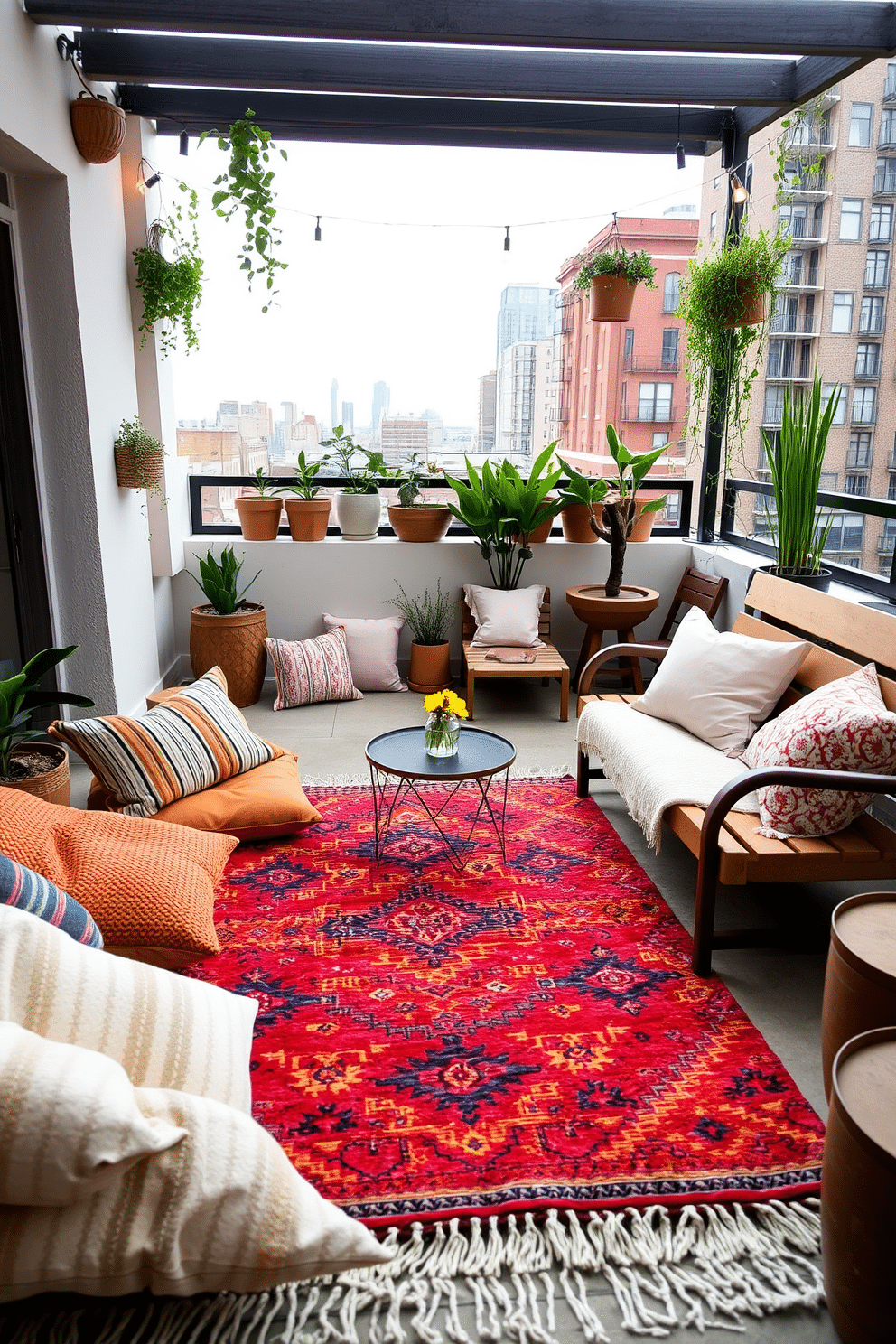 A boho-inspired living space adorned with a vibrant, handwoven rug in rich earthy tones lies at the heart of the room. Surrounding the rug are plush, overstuffed floor cushions in differing patterns of stripes and tribal motifs, creating a casual and inviting setup.