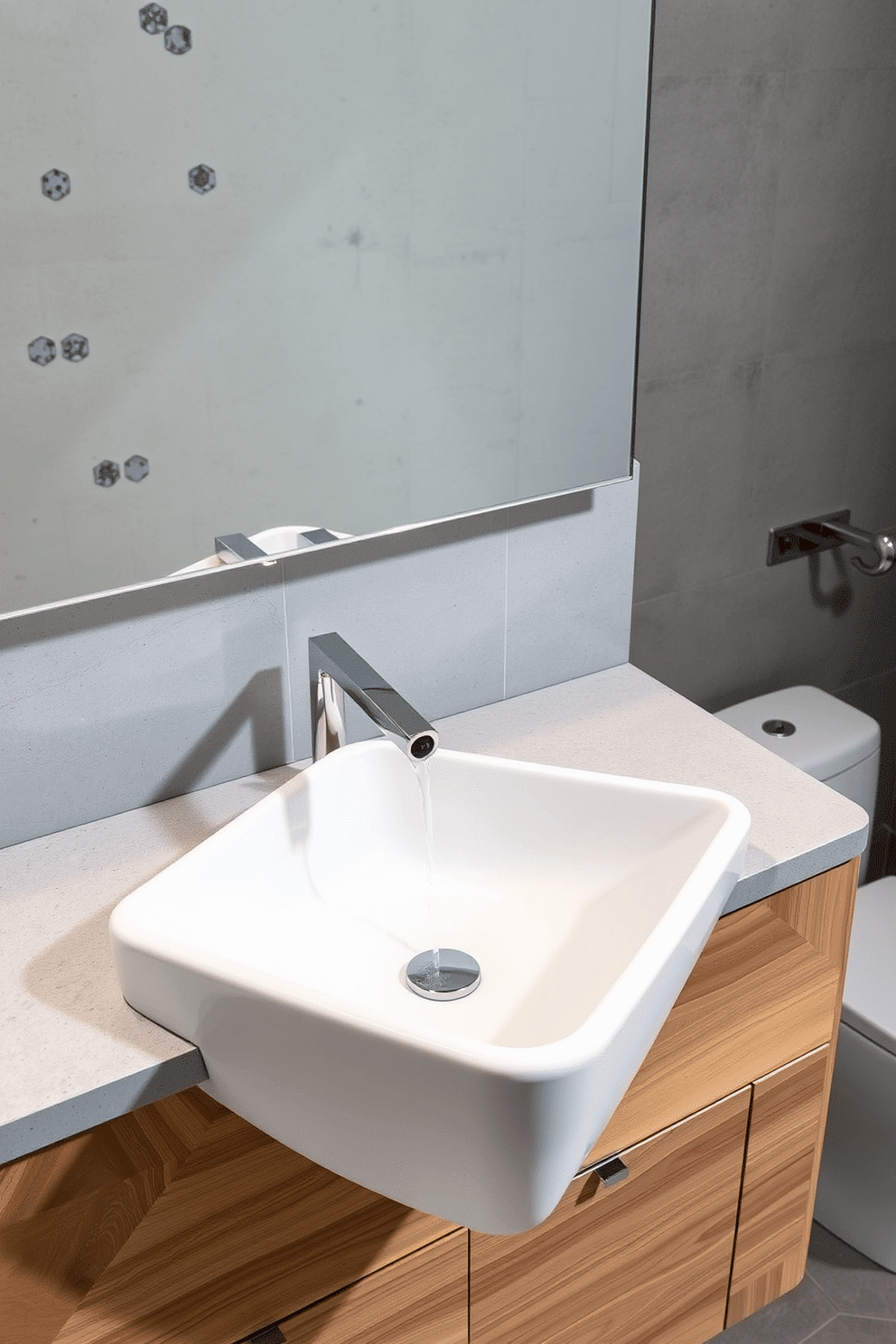 The surrounding vanity features a minimalist wood finish, offset by a gray quartz countertop. In the background, a textured concrete wall and hexagonal tiles complete the geometric aesthetic.
