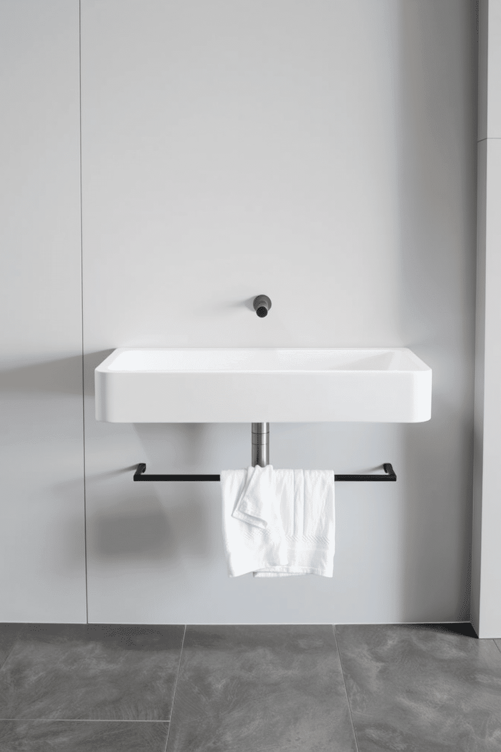 Below the sink, a thin metal towel bar in matte black holds neatly folded white hand towels. The flooring displays large-format concrete tiles in a soft charcoal hue, adding to the contemporary feel of the space.